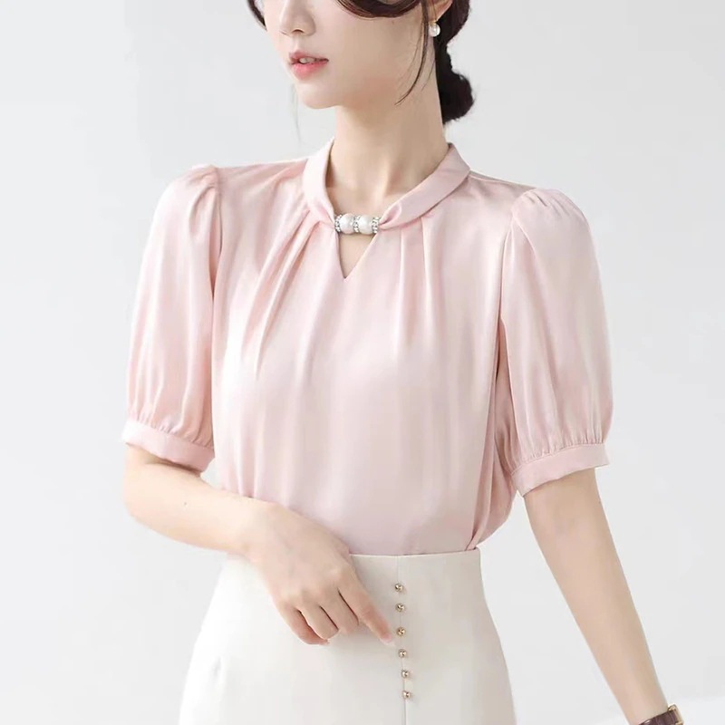 フレンチ風 ニッチなネックライン スタンドカラー ビーズ付きシャツ 女性用 2025年春新作 プルオーバー サテン素材 洗練された通勤用ビジネストップス