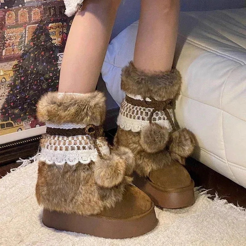 【厚底ファー付き】スノーブーツ レディース冬用 裏地付き厚手保温 ミッドカット可愛いファー綿ブーツ