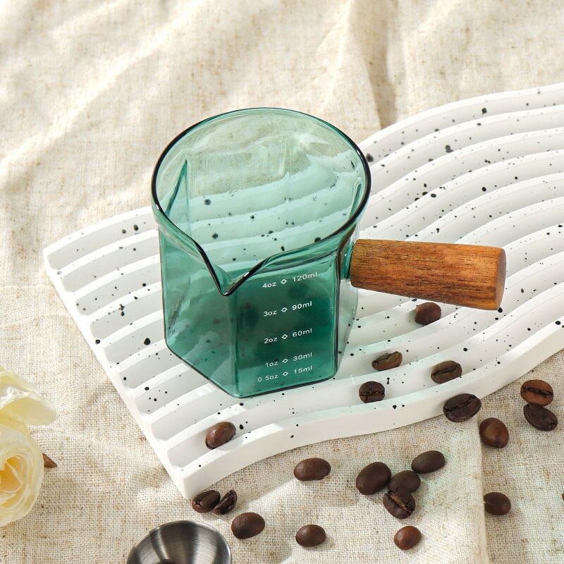 【タイムセール】計量カップ 2個セット 120ml 耐熱ガラス 目盛り付き ミルクピッチャー ミルクジャグ 小型 斜め注ぎ口 飛散防止 木製ハンドル 火傷防止 コーヒーピッチャー