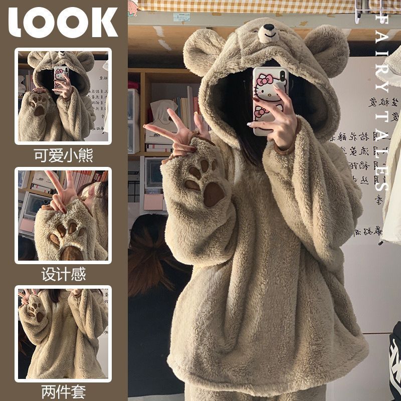 もこもこパジャマ 【急速出荷】 着ぐるみパジャマ ins甘くてかわいいヒグマのパジャマ女性保温冬の新型加絨加厚サンゴ絨毯の部屋着セット