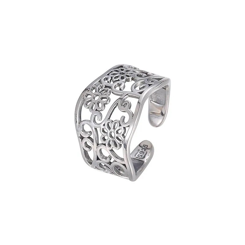 2026新作 指輪 S925 純銀 レトロ カットアウト フラワー リング レディース 韓国 スタイル ミニマル ユニーク デザイン ラグジュアリー ユニバーサル オープン リング