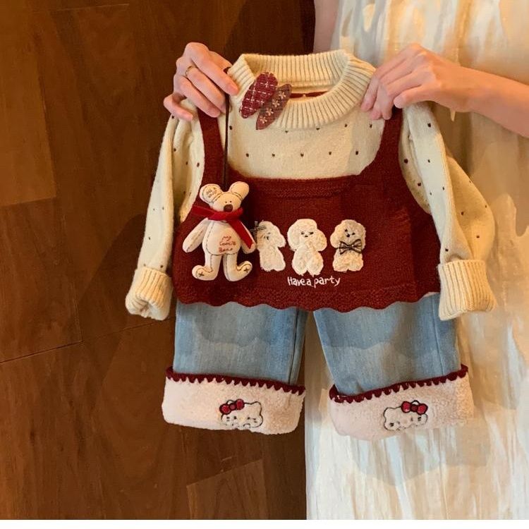 INS大人気 女の子秋冬服フルセット2026新作 女の子用厚手セーター+裏起毛デニムパンツ2点セット