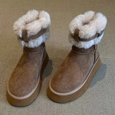 【レトロ 毛皮一体型】厚底ヒールアップショートブーツ レディース冬用 裏地付き保温ファー綿靴 防寒スノーブーツ