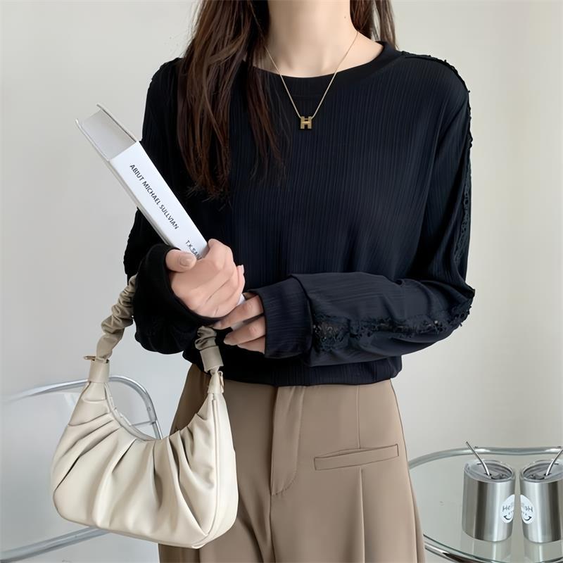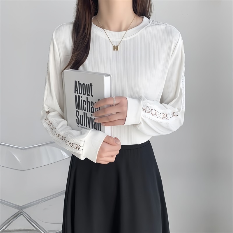 レーススリーブ トップス レディース 長袖 シワ加工 カットソー きれいめ 春 通勤 デイリー