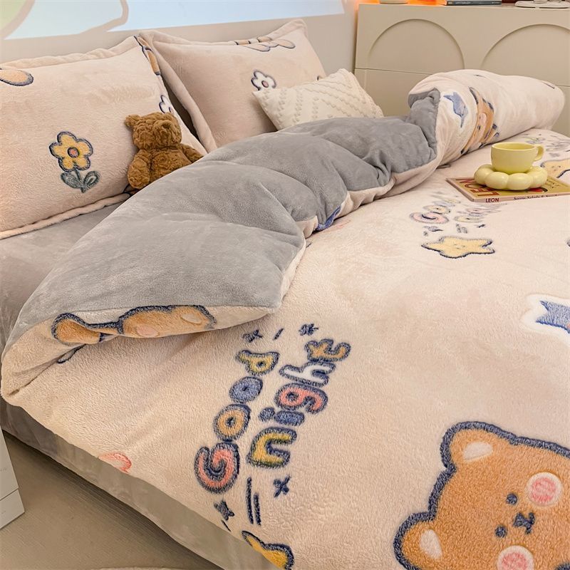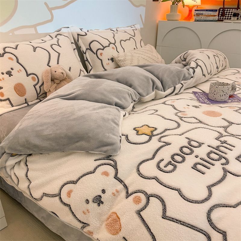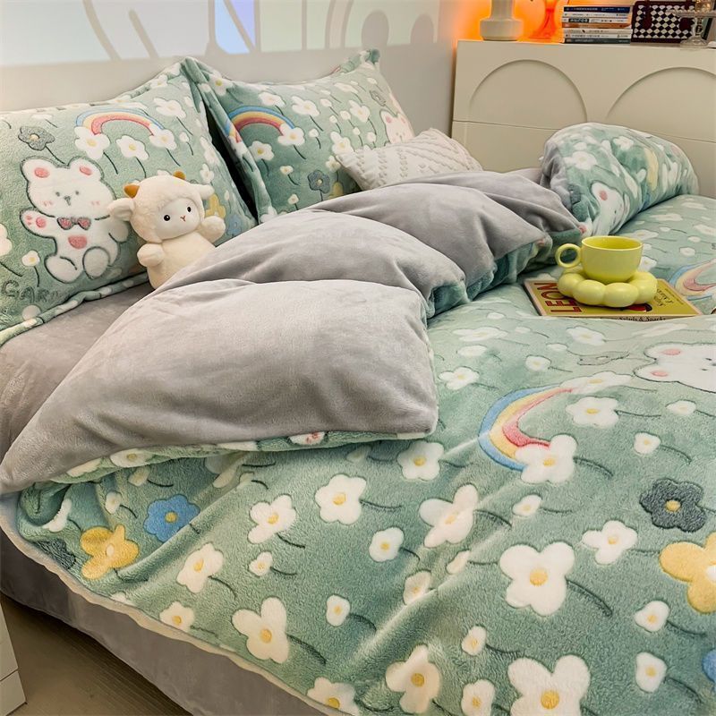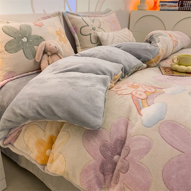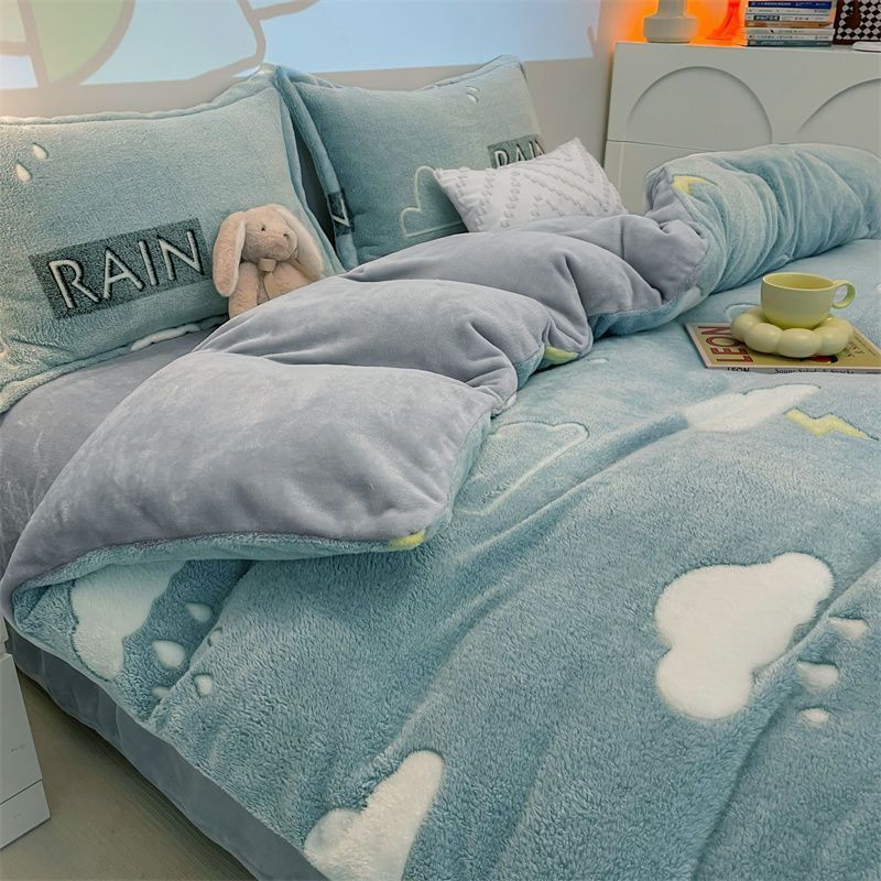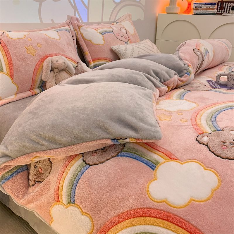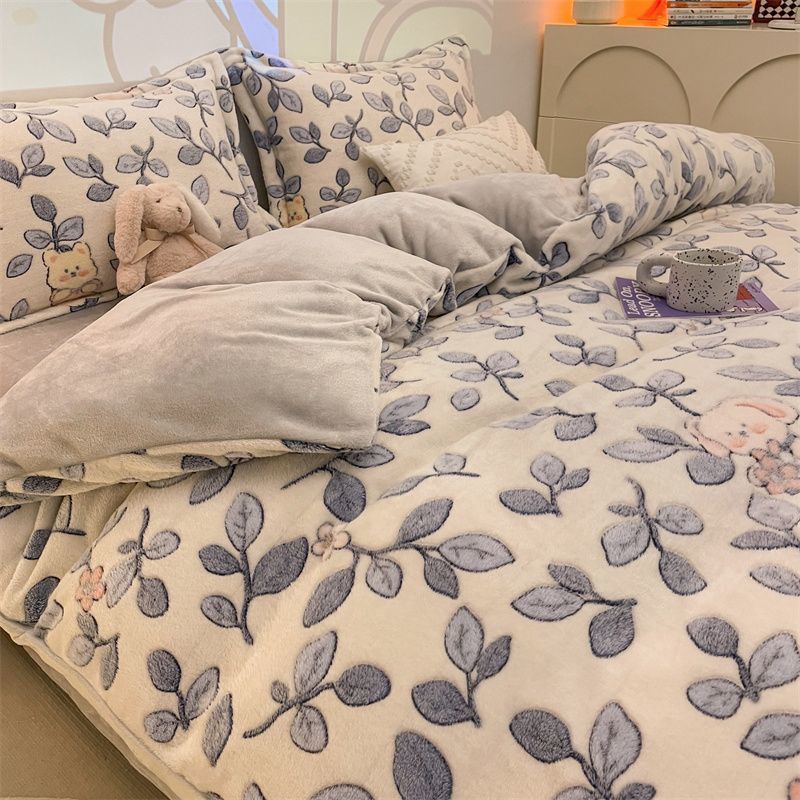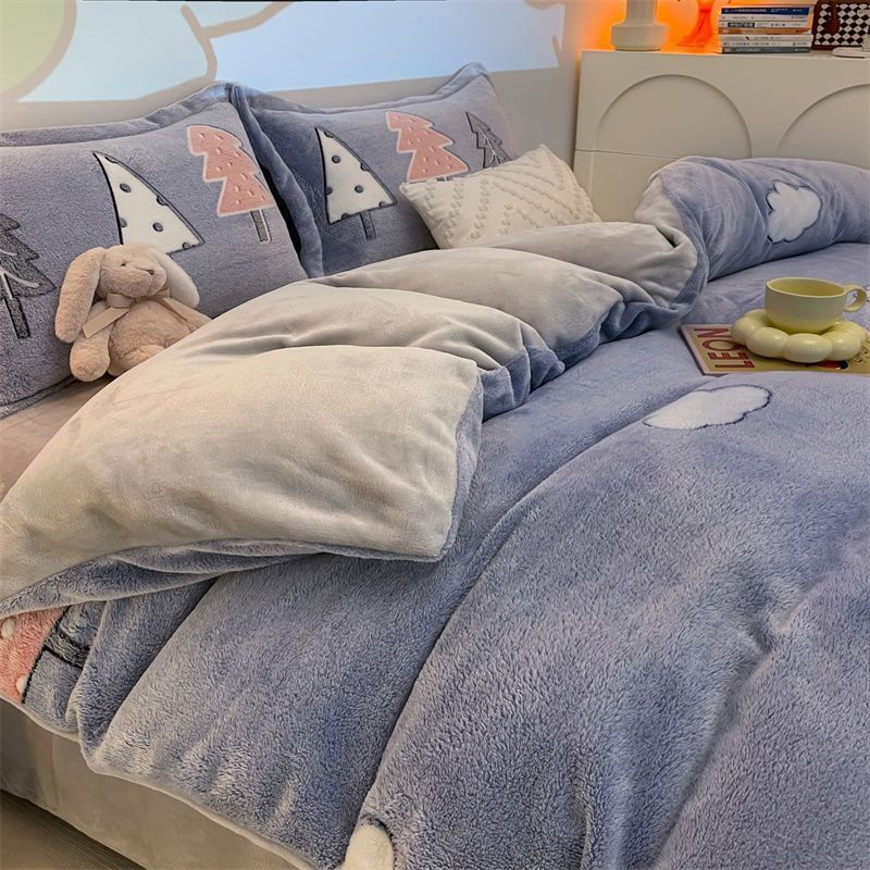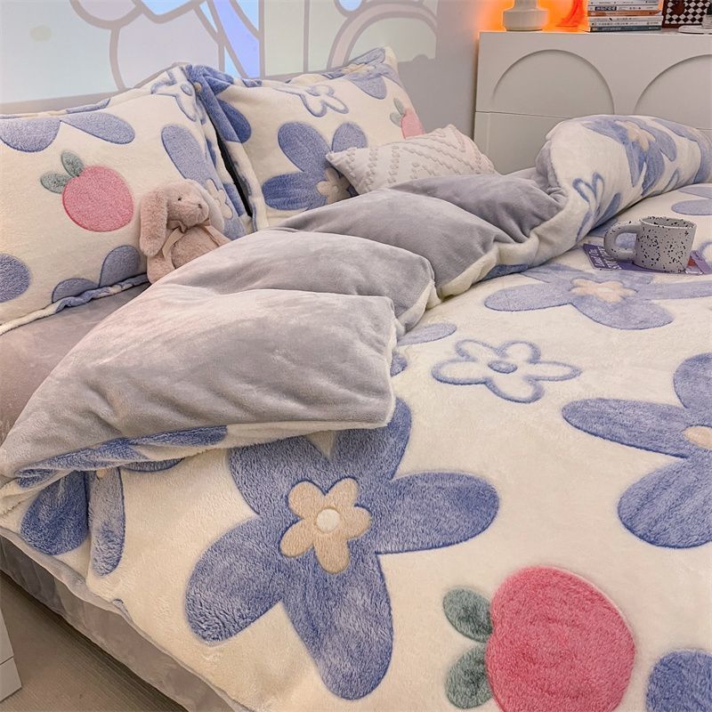 布団カバー 掛け布団カバー ベッドカバー ミルクベルベット寝具4点セット 用厚手サンゴベルベット布団カバー両面パッド入りフランネルシーツ3点セット