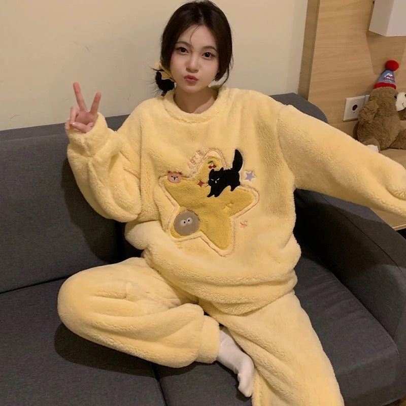 コーラルフリースパジャマ女性用秋冬用裏地付き保温学生少女向けキャラクターホームウェア