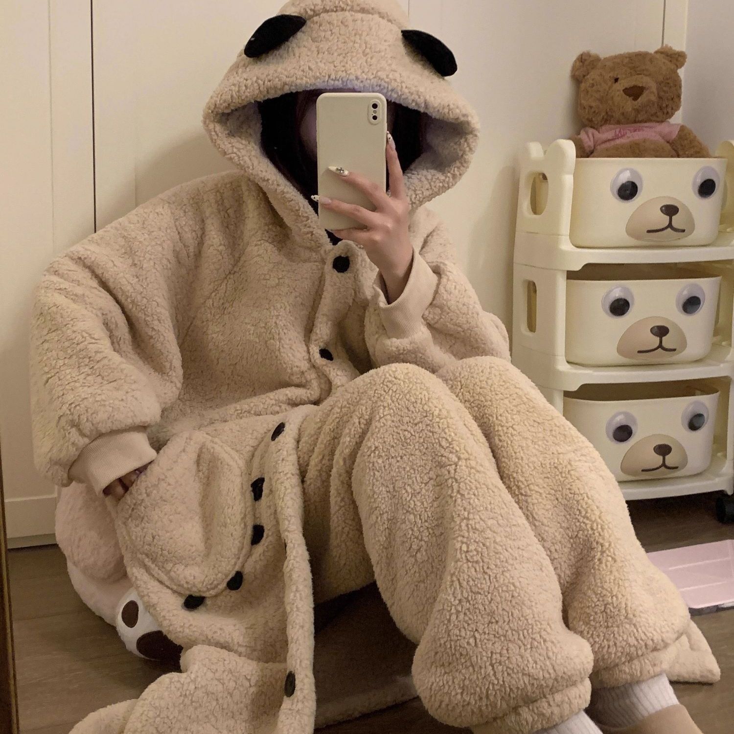 冬用クマ柄コーラルフリースパジャマ女性秋冬モデル2026新作厚手パジャマロングガウンルームウェア冬