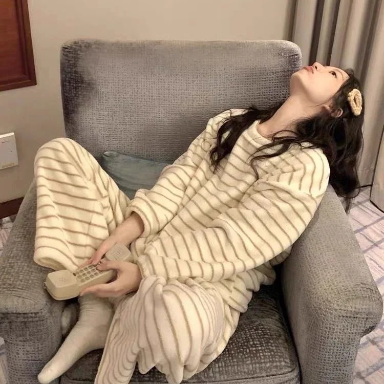 パジャマ 女性の冬用ゆったりフランネル 可愛くて暖かい長袖セット コーラルフリース ホームウェア