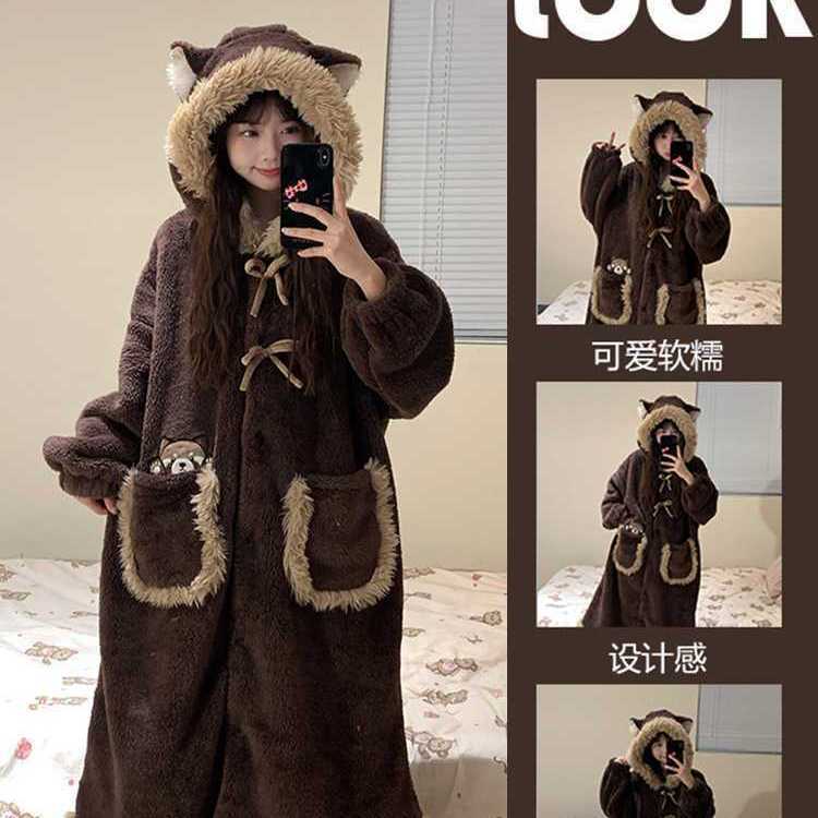 可愛いフード付きパジャマ コーラル ウィンター ふわふわ 新作 厚手 バスローブ 暖か 着回し ルームウェア セット