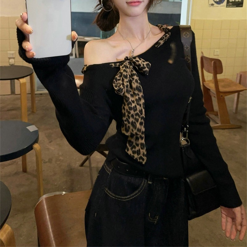 買い逃し注意 韓国ファッション Chic気質 長袖 肩出しトップス オフショルダー アシンメトリー リボンタイ スリムシルエット デザイン感満載 初秋トップス 肌触りもちもち
