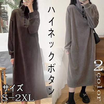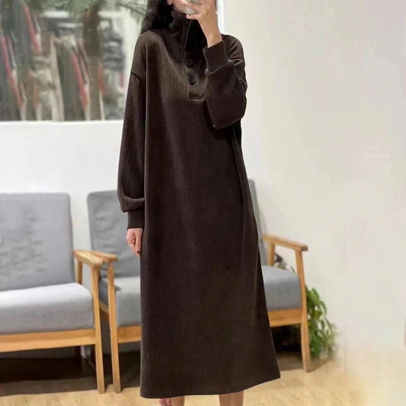 新作ハイネックボタンワンピース 韓国風ラフな秋・冬ファッション 合わせやすいロングスリーブロングドレス ロング丈・長袖