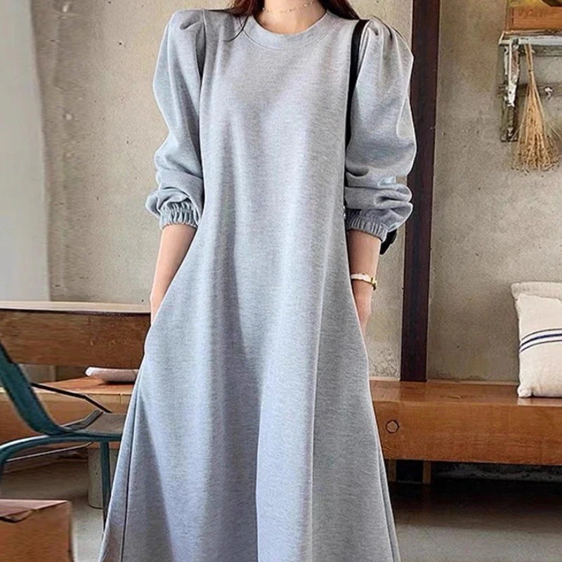 裏起毛ロング丈フーディワンピース ラウンドネック・ダブルポケット・ウエストシェイプ 韓国新作シック秋冬シンプルAラインロング丈・長袖