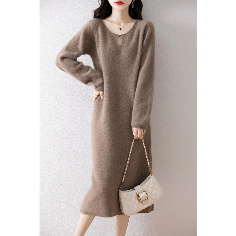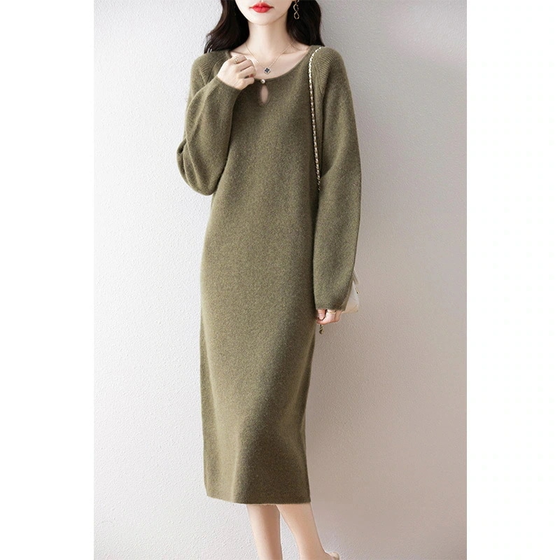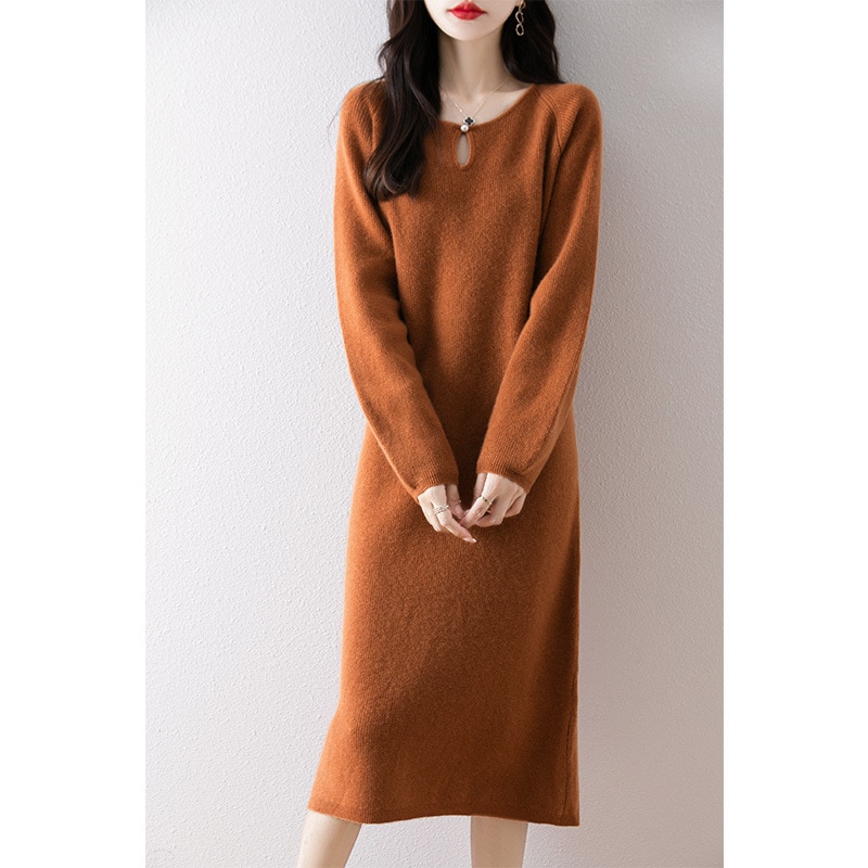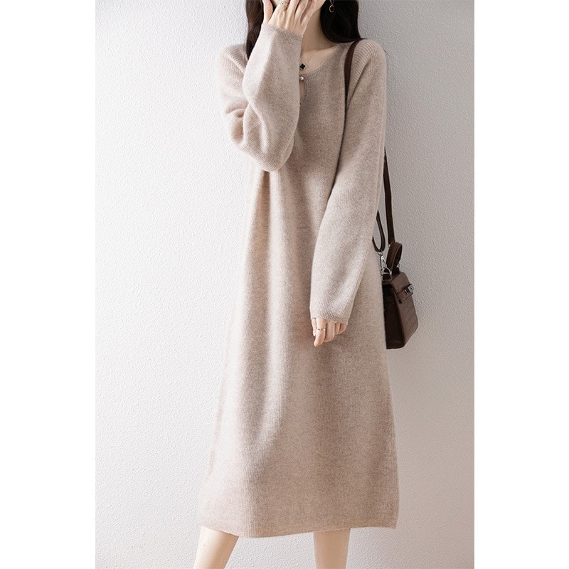 無地ワンピース 春秋冬新作 レディース ラウンドネック 気品あるミディ丈 ゆったりシルエット 細身効果 ニットトップス おしゃれなロング丈ベースレイヤードスカート・長袖