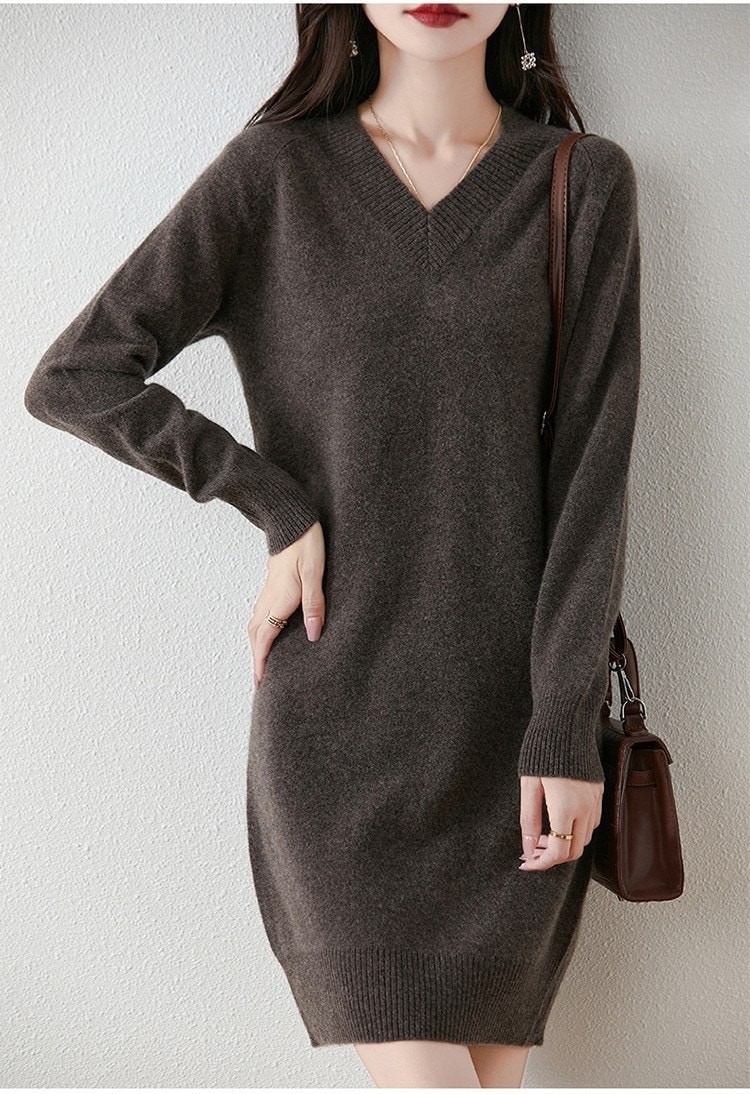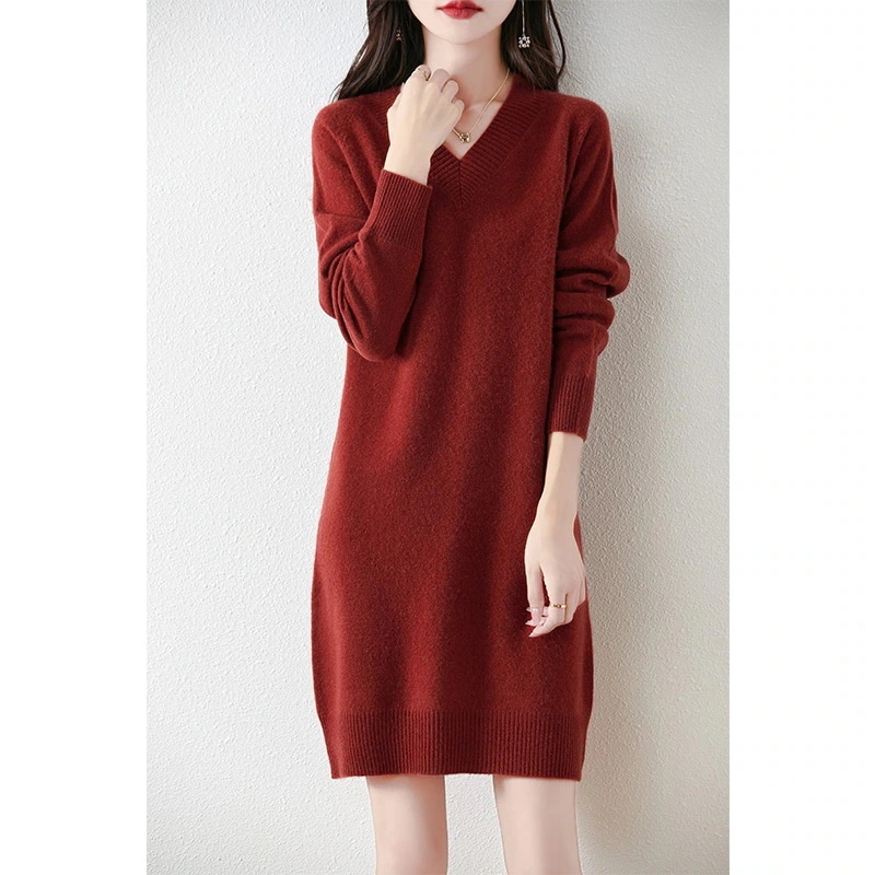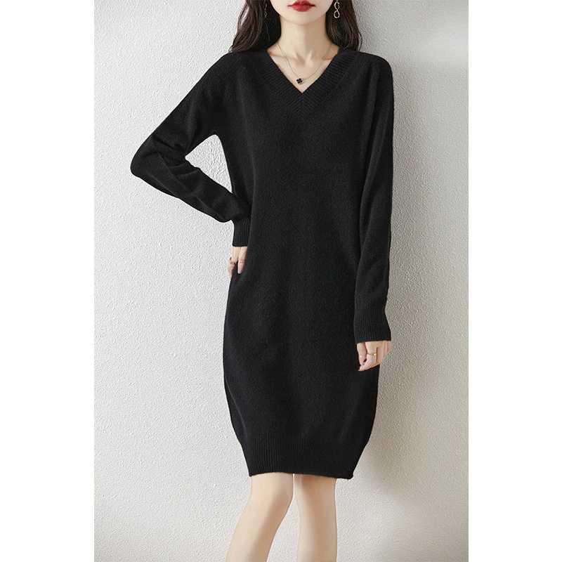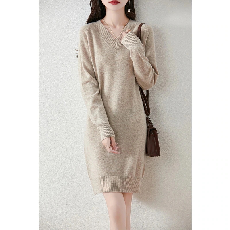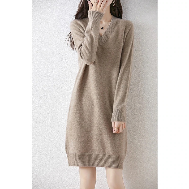 秋冬新作レディライクVネックニットワンピース ロング丈長袖セーターゆったり保温ベースレイヤードロングスカート・長袖