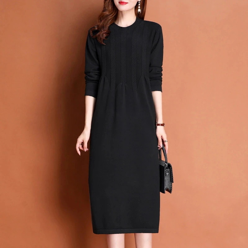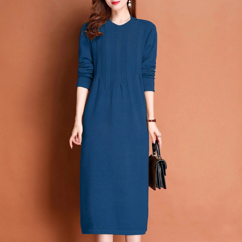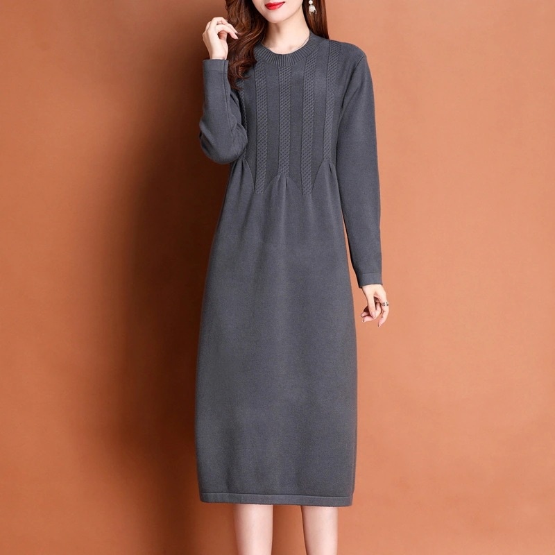 ロング丈ニットワンピース レディース 秋冬用 膝丈 ゆったり レイヤード用 丸首プルオーバー 単色 ベースレイヤー ニットワンピース ロング丈・長袖