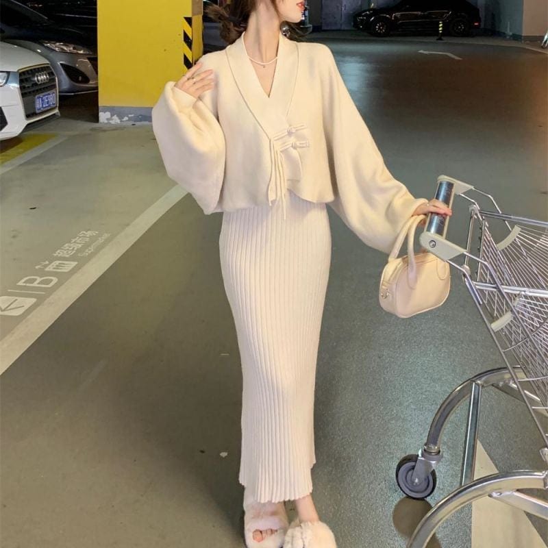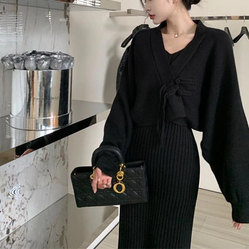 2026年秋冬スカートセットアップ 新作スイート&スパイシー風カーディガン・ジャケット ニットボディコンストラップドレス ロング丈・長袖