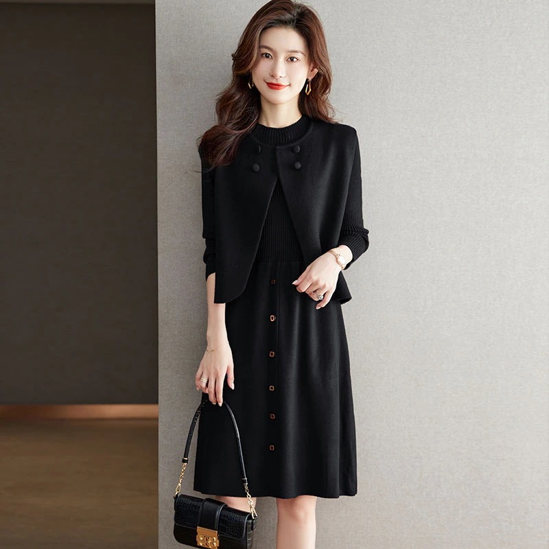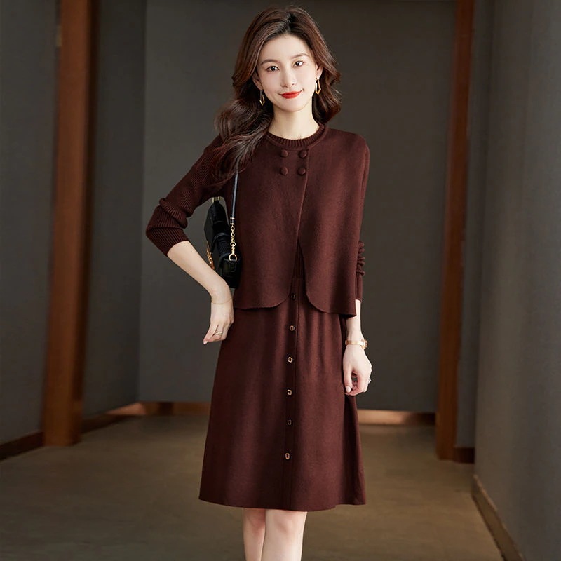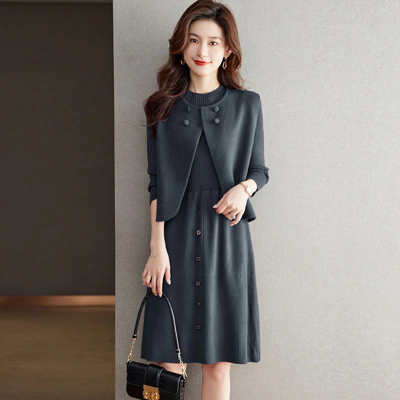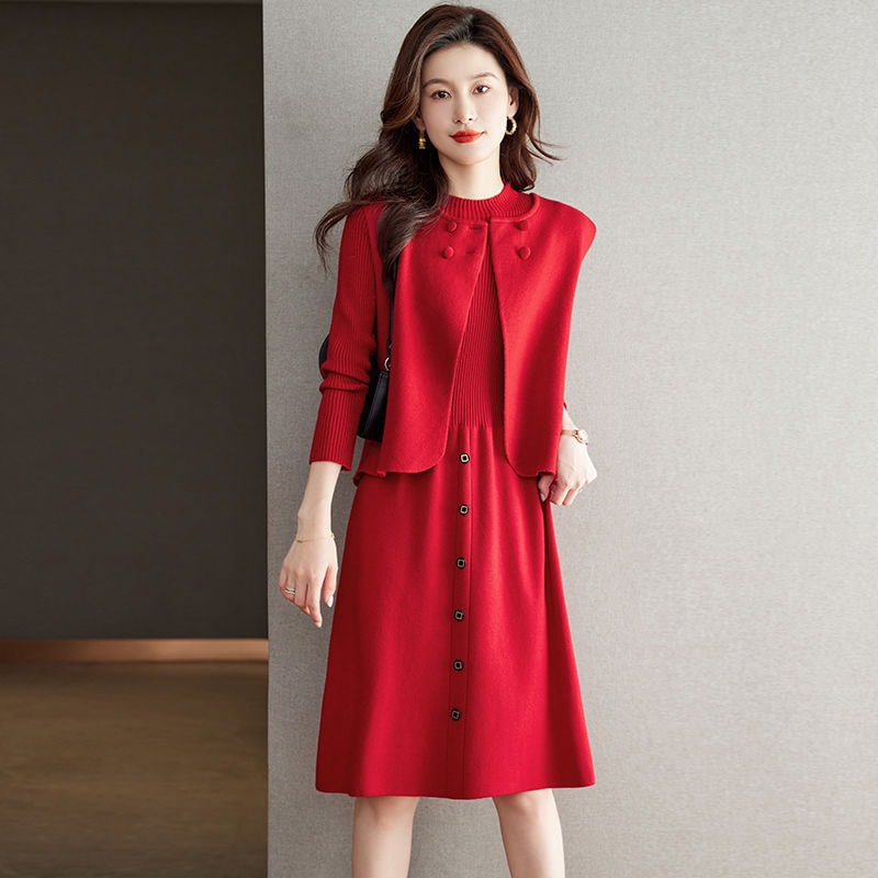 ファッショナブルなベスト付きツーピース ニットワンピース 新作無地ニットワンピース 気品ある秋冬用ミディ丈おしゃれなセットアップ