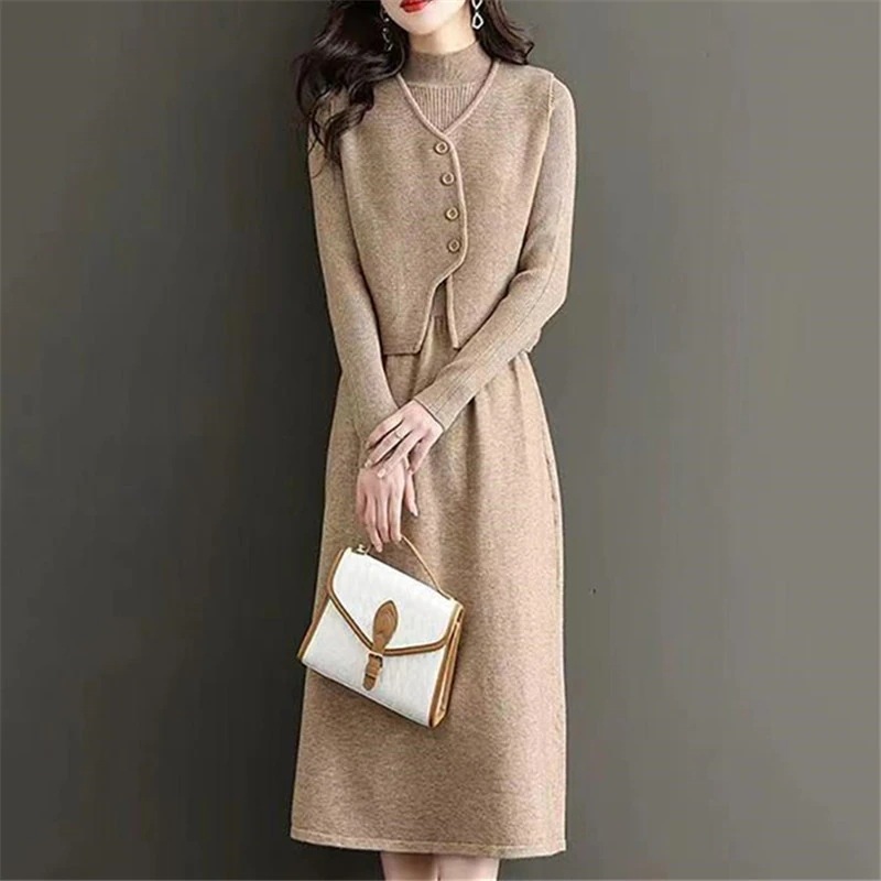 2026年秋冬新作ニットワンピース スリムシルエットのエレガントベスト付きロング丈ニットワンピース2点セット・女性用ロング丈・長袖スーツ
