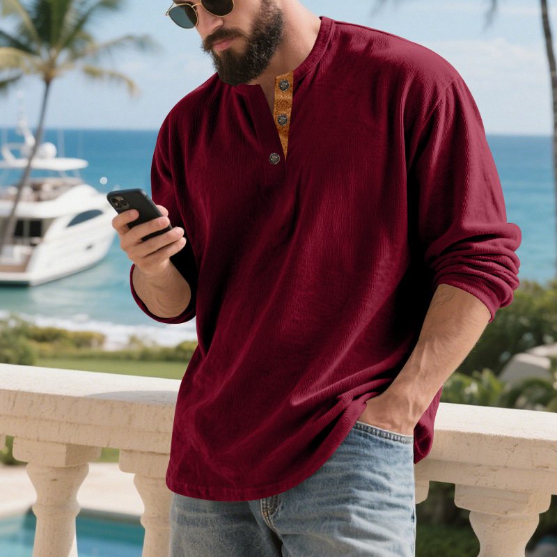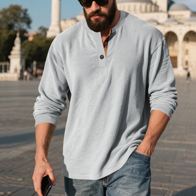 【新作お得】コーデュロイtシャツメンズ長袖ヘンリーネックカットソークルーネック丸首無地トップスシンプルカジュアルお