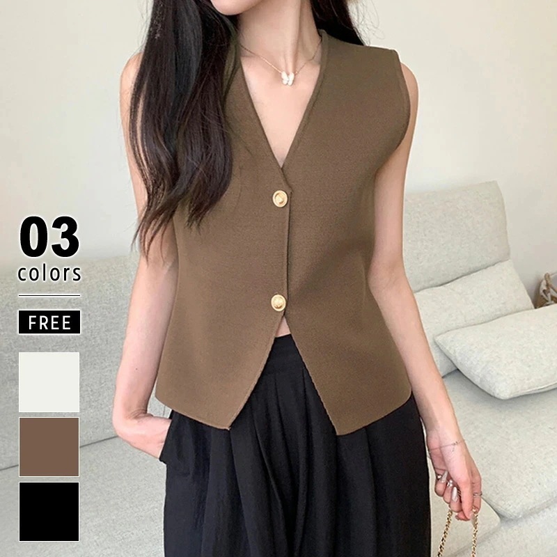 ベスト 金ボタン Vネック ノースリーブ スリット 前開き レディース ニットベスト ニット オシャレ トップス ニットトップス vネック ノーカラー トップス 伸縮性 レトロ カジュアル きれいめ