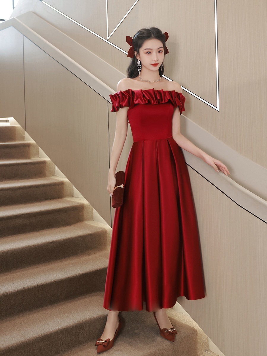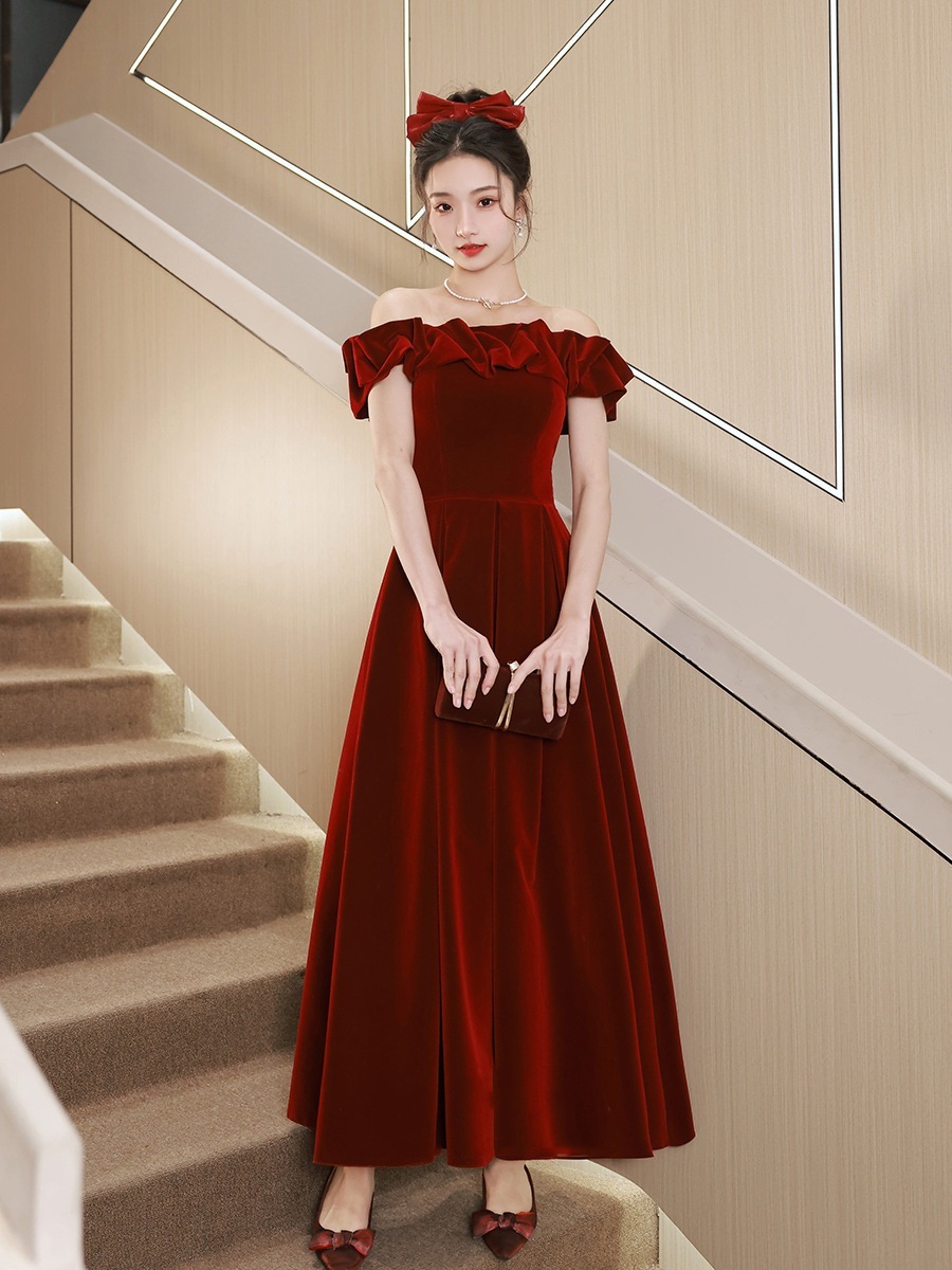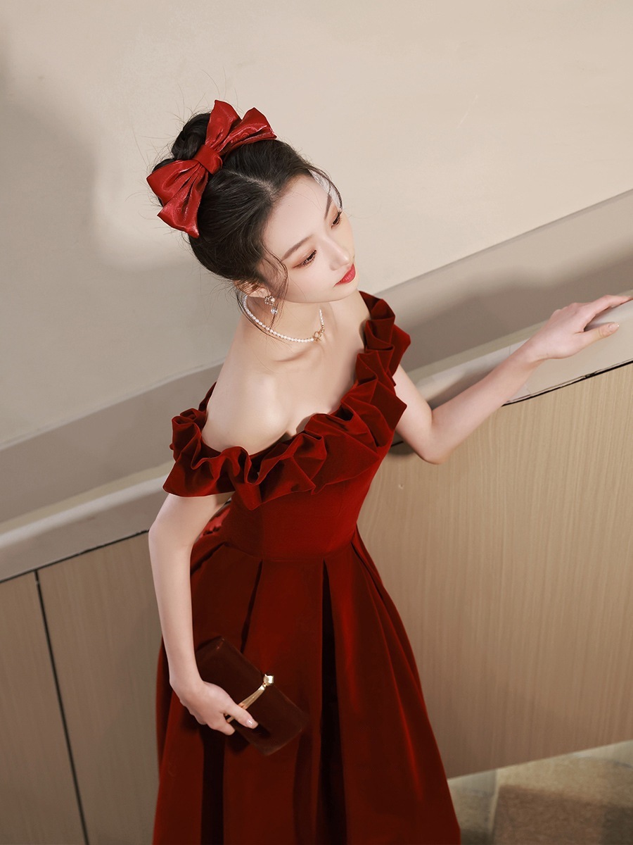 ワインレッドワンショルダーイブニングドレス花嫁婚約披露宴ドレスフェミニンエレガント高級感ワンピース敬酒服