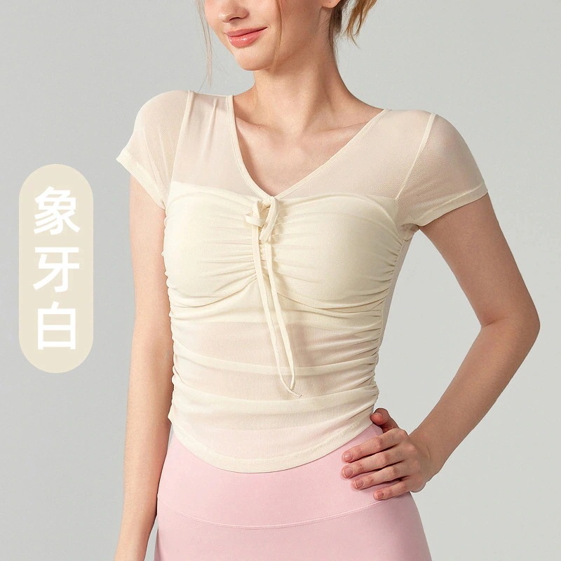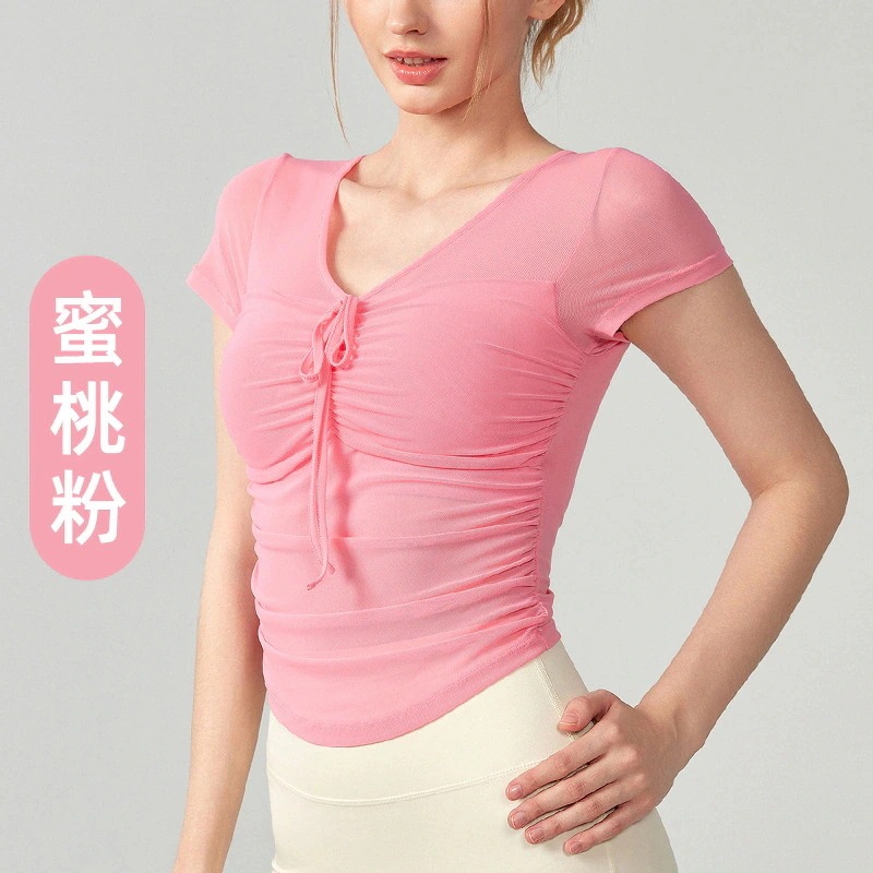 新作ヨガ半袖Tシャツ女性胸パッド付き春夏スリムで薄いメッシュやや透けるショートセクショントップス
