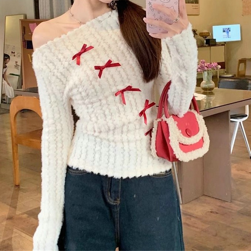 【秋冬限定】リボンオフショルダーニット レディース 秋冬新作 もちもち肌触り スリム着痩せ ユニークデザイン おしゃれトップス