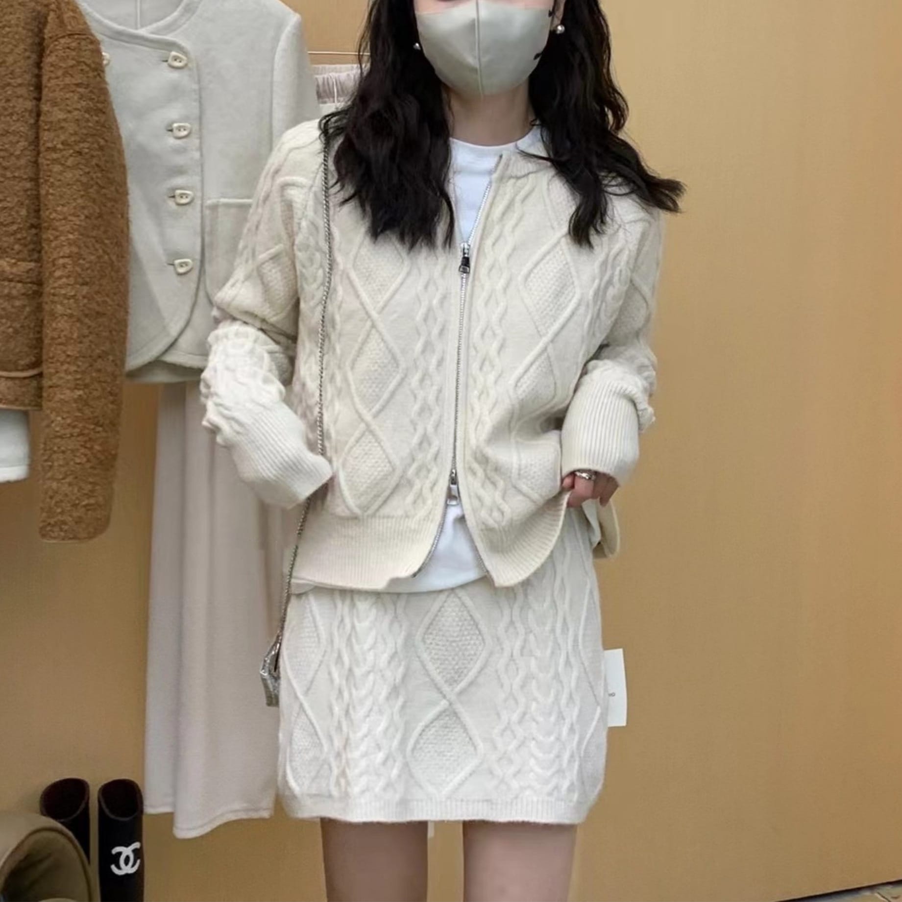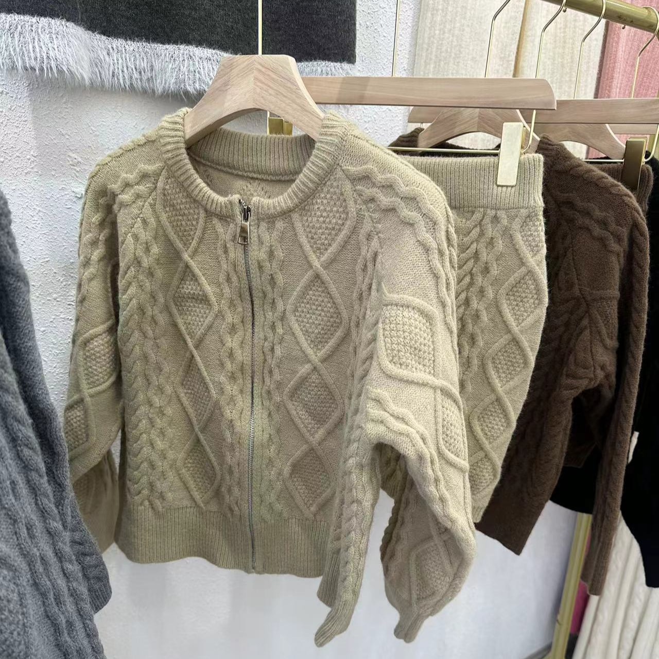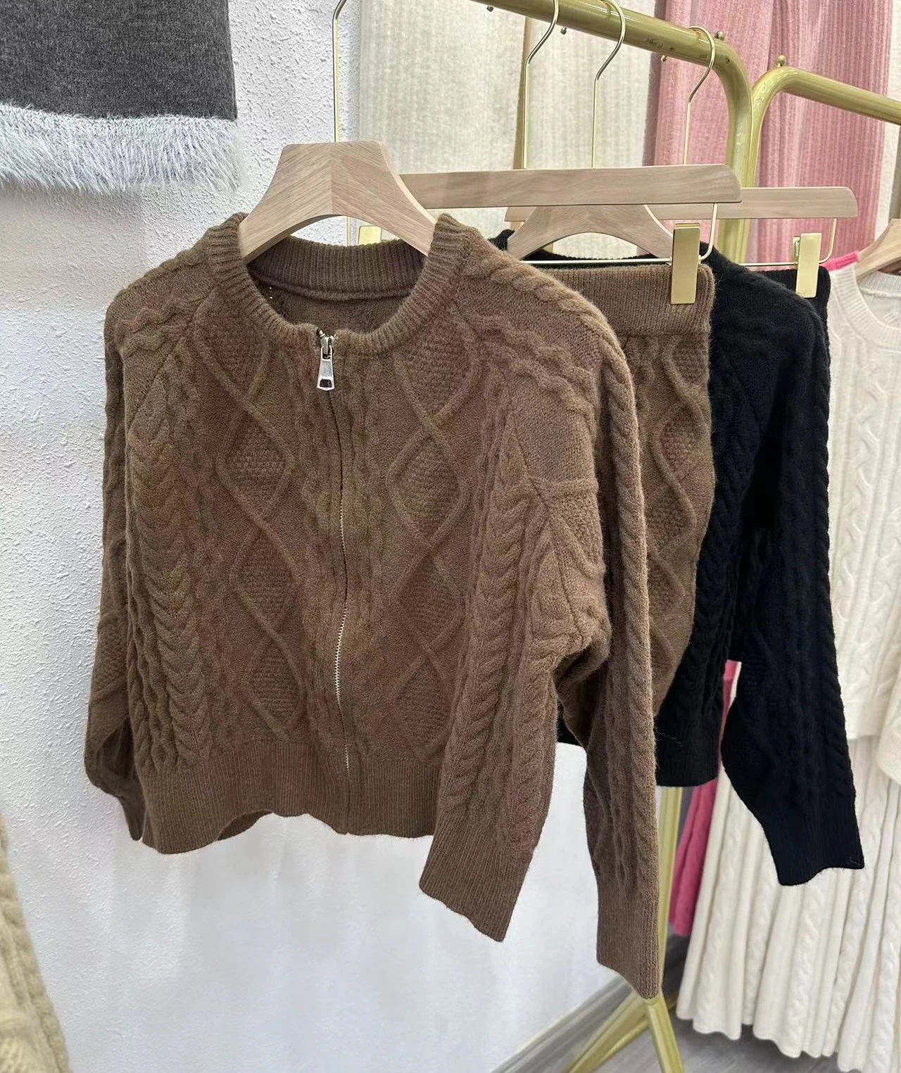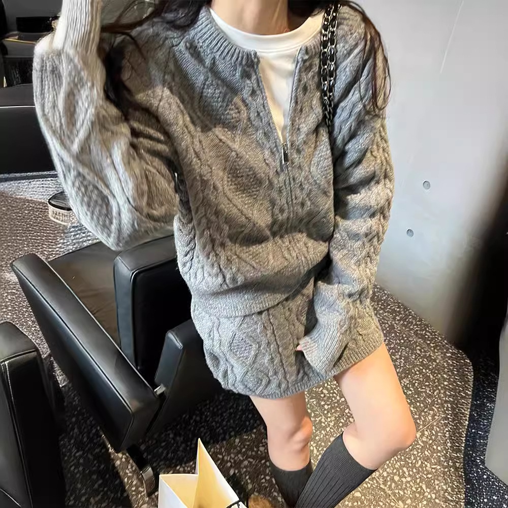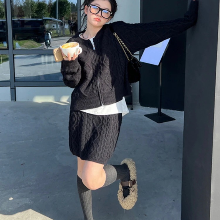 秋冬都市レトロカジュアルニットセット女性用 ファスナー付きカーディガンジャケット+ミニスカート2点セット