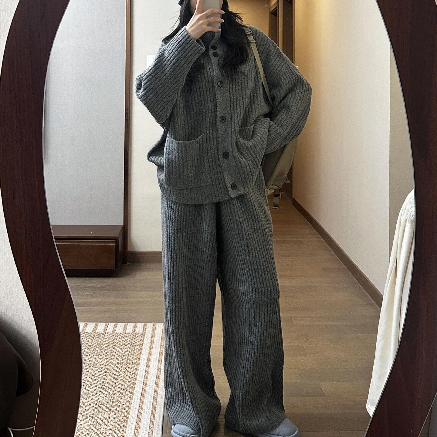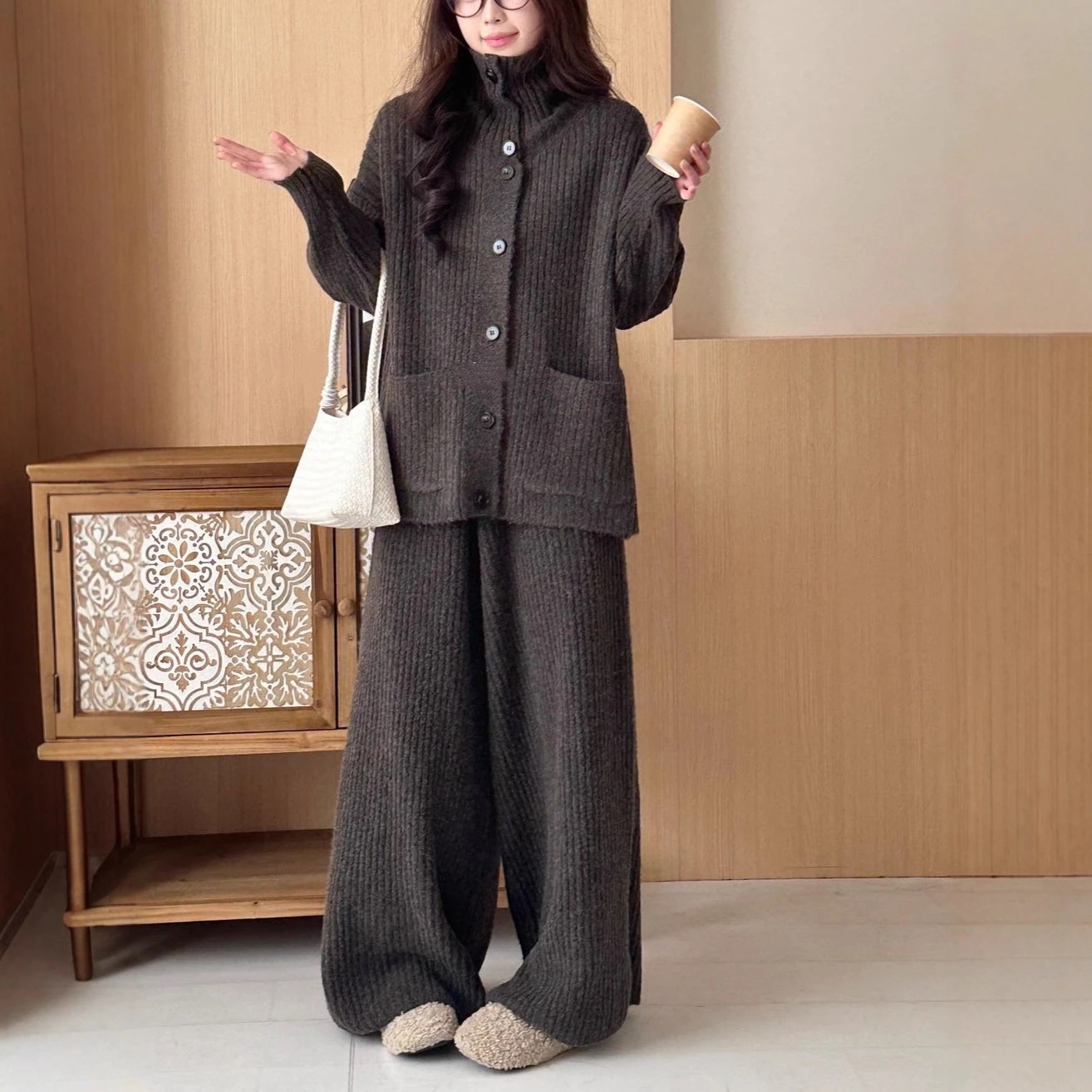 韓国風 カジュアルニットセット 婦人用 秋冬新作 厚手 ハイネックカーディガン+ルーズワイドパンツ 2点セット