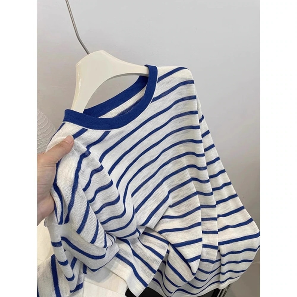 2025 秋冬 ニット カジュアル 日焼け防止 ボーダー柄 サマー ニットトップス ゆったり 長袖tシャツ レディースファッション