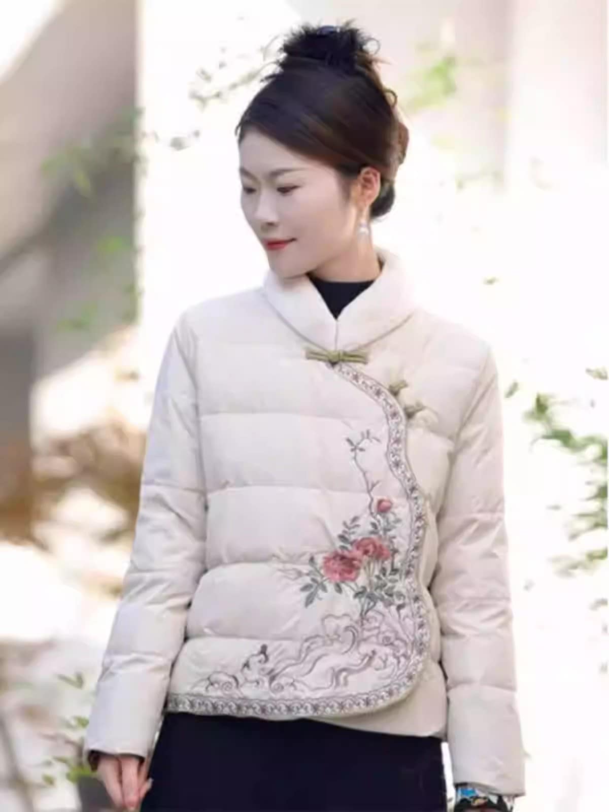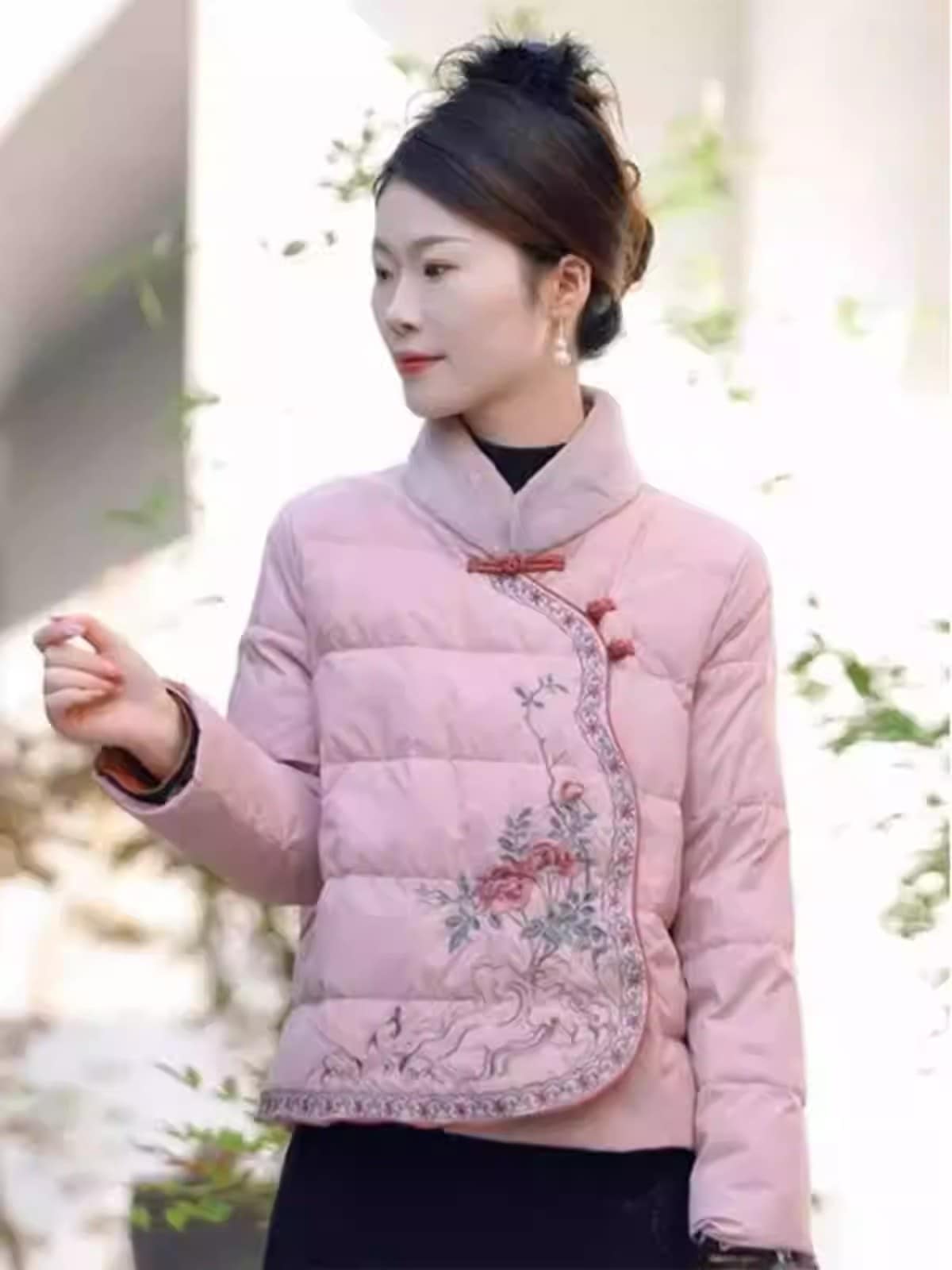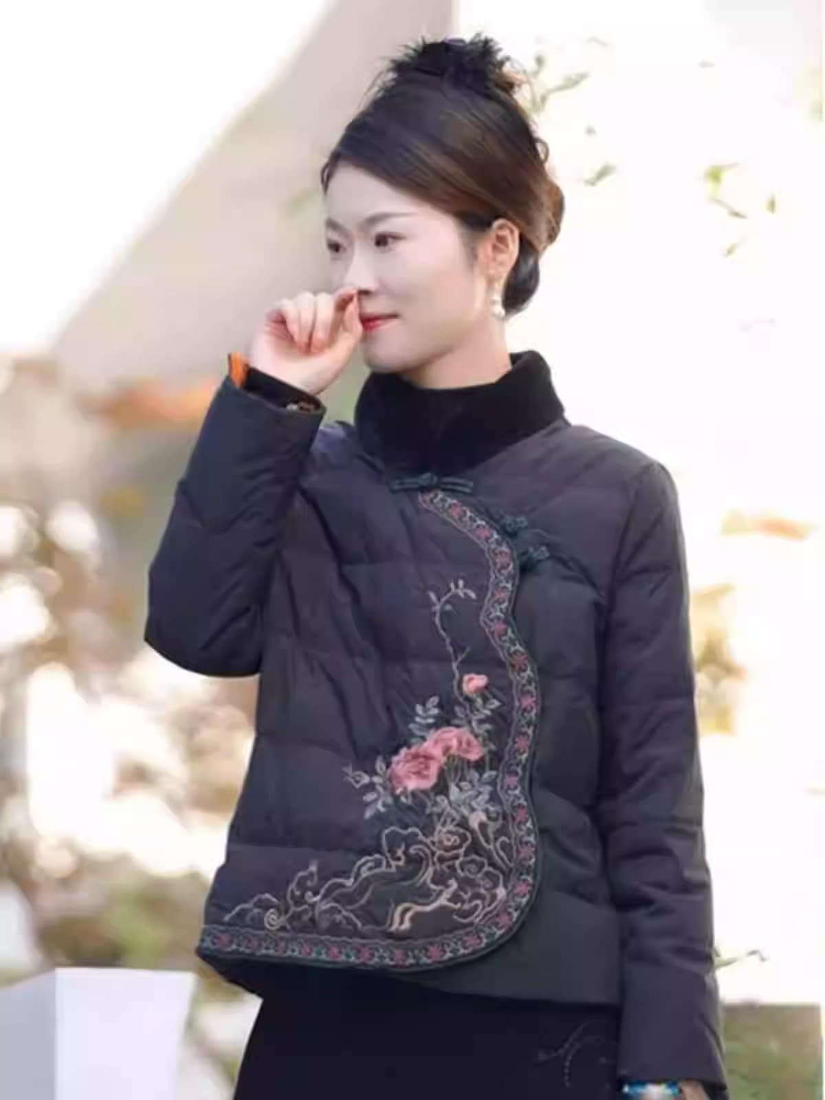 新中式レトロボタンダウン羽織り綿入れコート 製品気質 女性秋冬 国風豪華刺繍高級感ファー付きダウンジャケット
