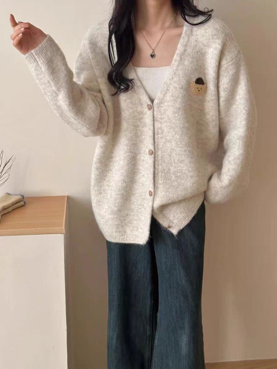 SALE!優しい風Vネックゆったり小熊ニットカーディガン くつろぎ感あるニッチなトップス ニット女性用アウター トレンド