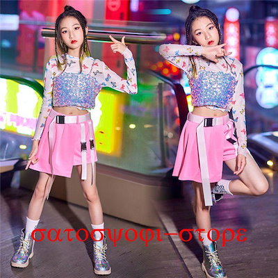 新作即納キッズダンス衣装 女の子 ヒップホップ キラキラ ヘソ出し カッコイイ ジャズダンス jazz スパンコール セットアップ チアガール ダンス衣装 4点セット 蝶々柄キッズダンス衣装 女の子