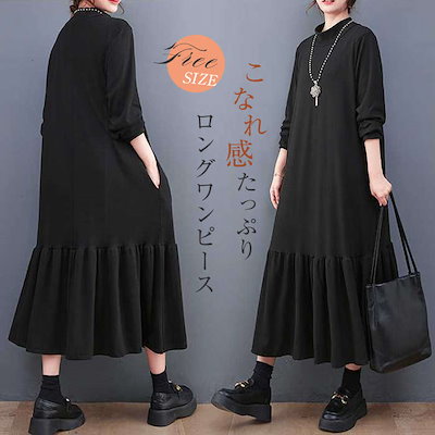 ロングワンピース レディース 長袖 マーメイドワンピース 秋 冬 黒 大きいサイズ フレアワンピース 春秋 きれいめ マキシ丈 無地 ハイネック マキシワンピース ビッグシルエット ゆったり カジュア
