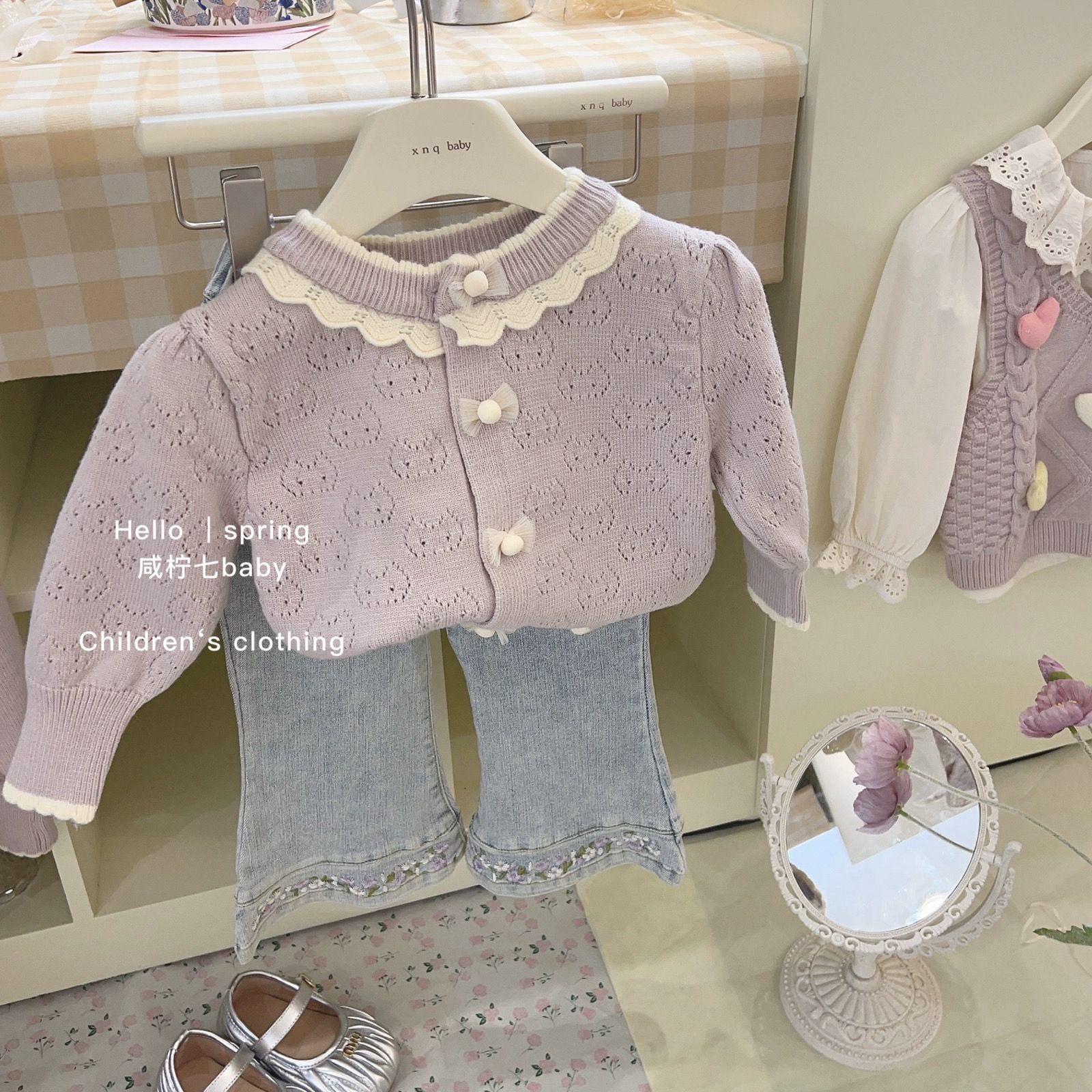 再入荷品スタイル ファッショナブルな紫のレース襟カーディガン ブルー刺繍ジーンズ ツーピース ベビー服 ベビー服 子供服 ベビー用品 子供ワンピース ベビー服 女の子
