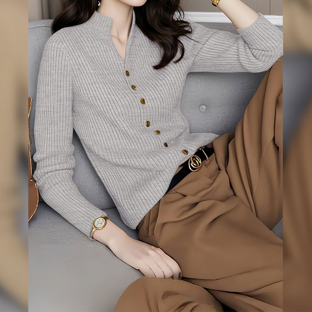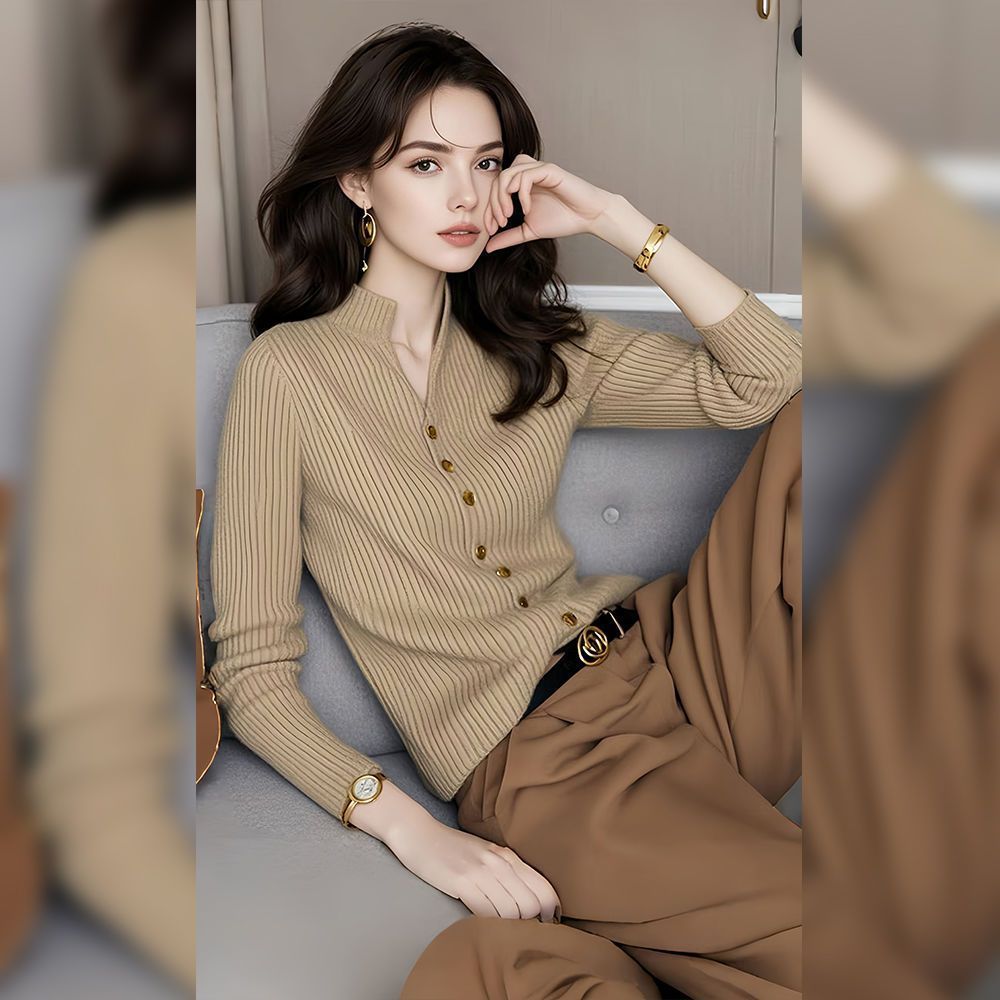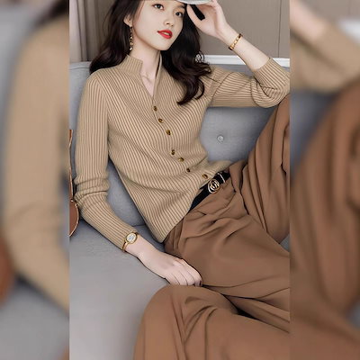 ベージュベースレイヤー女性秋用インナー兼アウター高級感コーデニットおしゃれ独特小トップス
