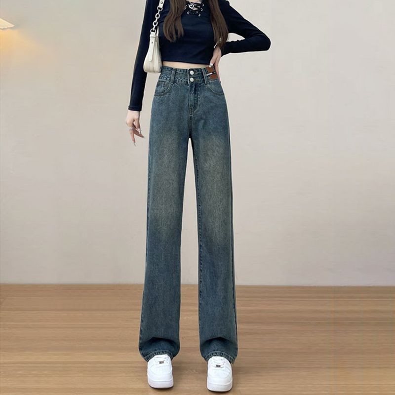 レトロダブルボタンデニムパンツ レディース 春季新作 春秋用ストレートルーズ ハイウエスト細身効果 床すれワイドレッグデニムパンツ