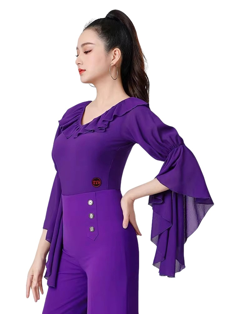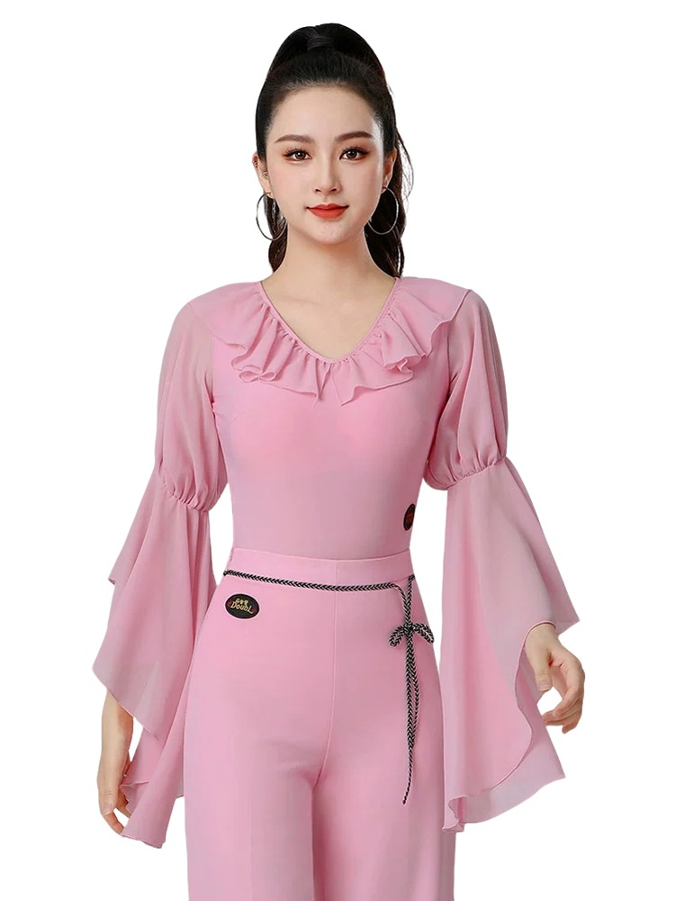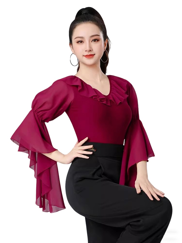 ラテンダンス衣装 トップス Vネック 社交ダンス 練習着 トップス レオタード 大人 スピーカースリーブ フラメンコ衣装 連体服 ダンスウェア モダンラテン衣装 ダンスTシャツ 肌着 発表会 ステージ