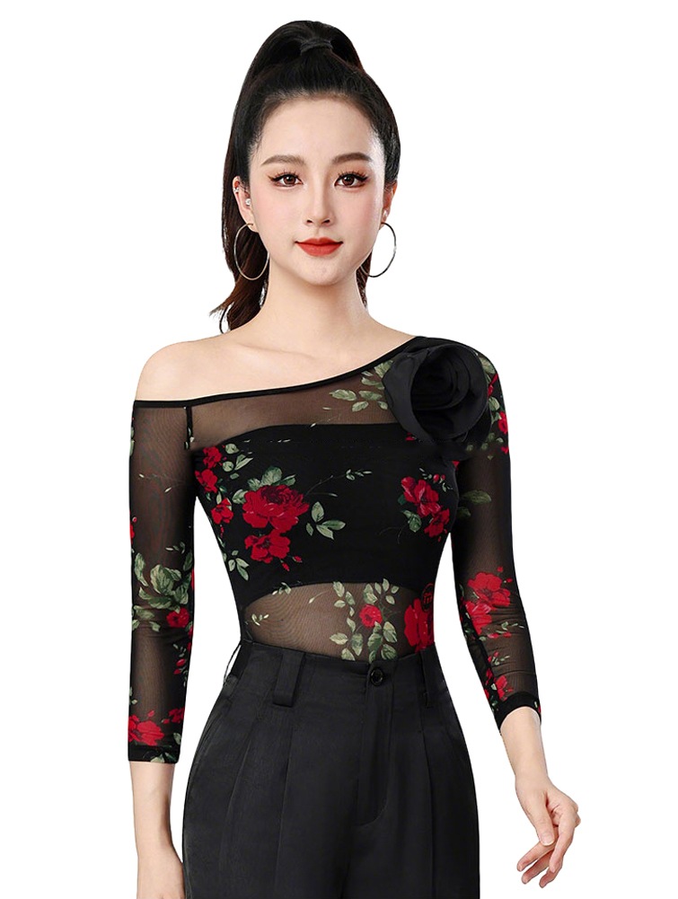 ラテンダンス トップス レオタード 大人 バラ柄 社交ダンス トップス レディース オールインワン チャチャチャ インターナショナルダンス モダンラテン衣装 ダンスTシャツ 発表会