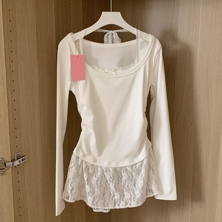 春秋新作 純粋で官能的なバレエ風 偽ツーピース レースネックストラップ長袖Tシャツ 女性用 インナー レイヤードトップス
