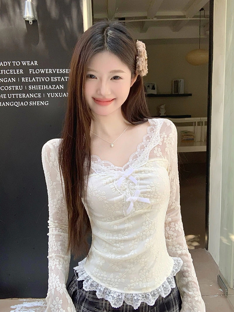 純粋な欲望を誘うアプリコットカラー レースフリル Vネック Tシャツ 女性用 春用インナー ショート丈ユニークで絶妙な美しさのトップス