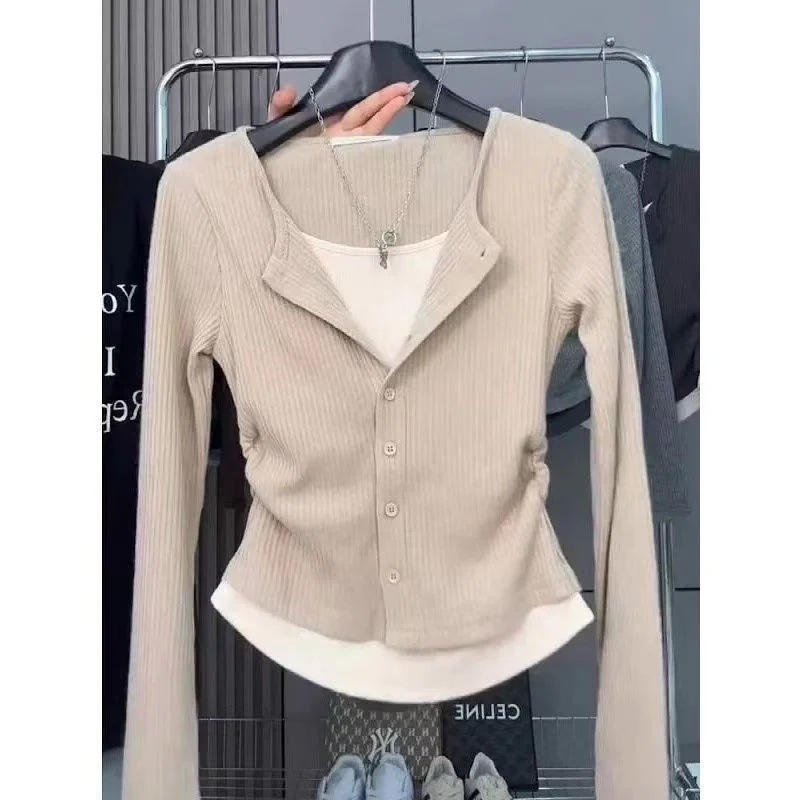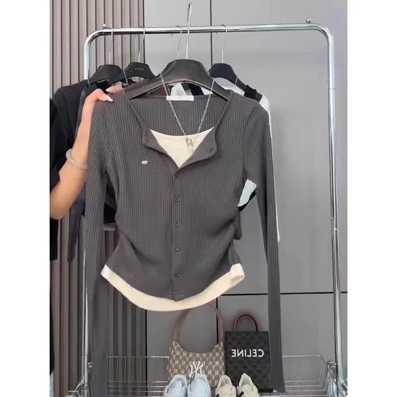 コントラストカラーのパッチワーク風ツーピース風 シングルボタン 長袖Tシャツ 春のプリーツ シェイプアップウエスト 細身効果のあるベースレイヤー