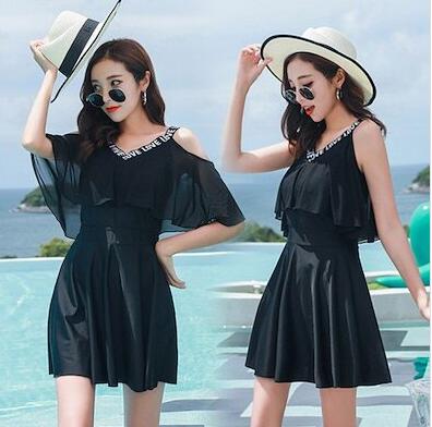 水着レディース 体型カバー 水着 ワンピース型 セパレート 肩出し 小胸バンドゥ 水着2点セット 黒 フリル 韓国風 40代 大きいサイズ 可愛い ウェア 温泉 ママ