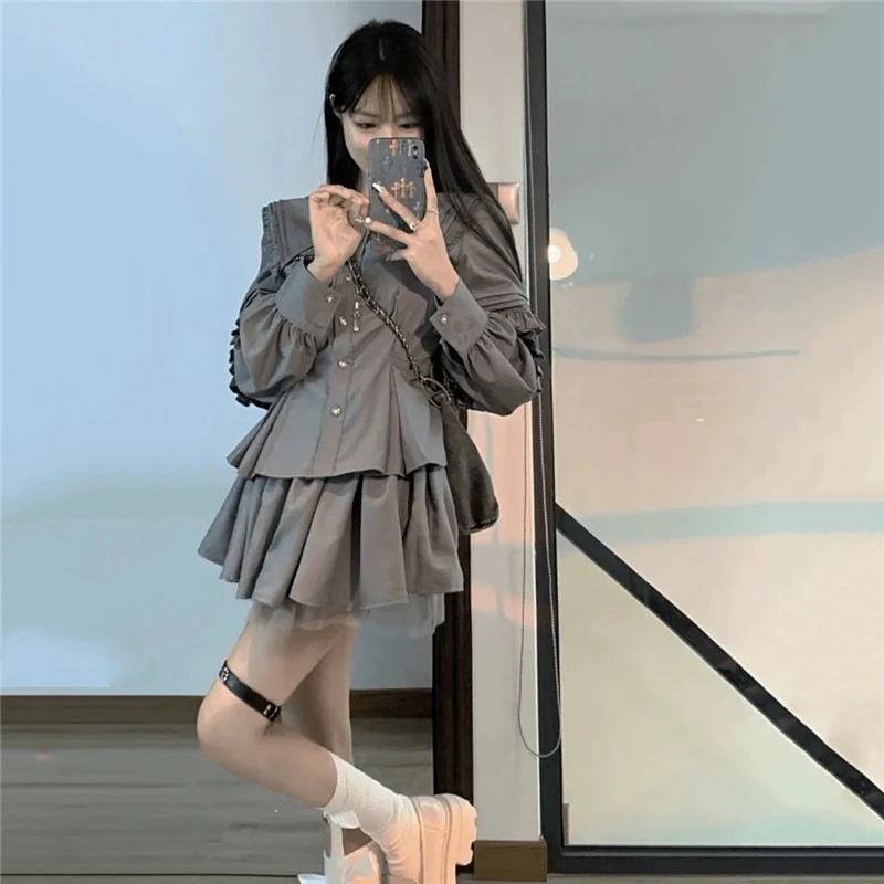 韓国ファッション セットアップ レディース ロリータ服 Lolita 洋服 Aライン ミニスカート 長袖 シャツ トップス おしゃれ 上下セット 春夏秋服