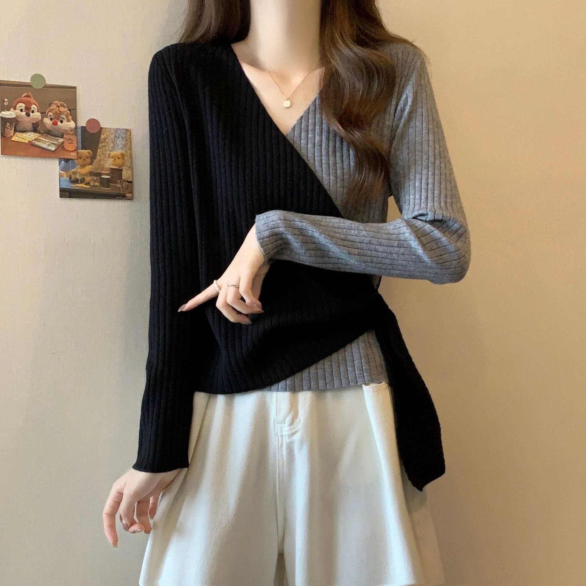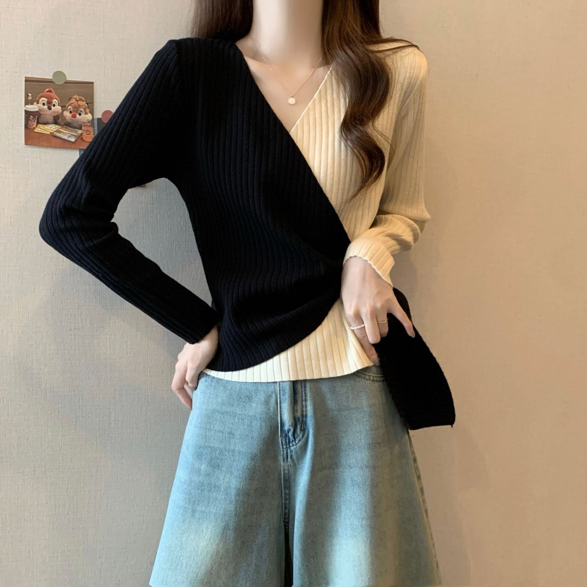 ニッチカラーブロックVネック秋用シルエット補正 不規則ウエストシェイプ長袖Tシャツ セクシーで官能的なトップス レディース