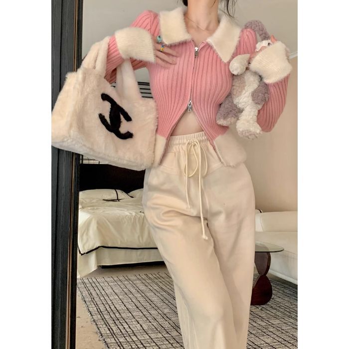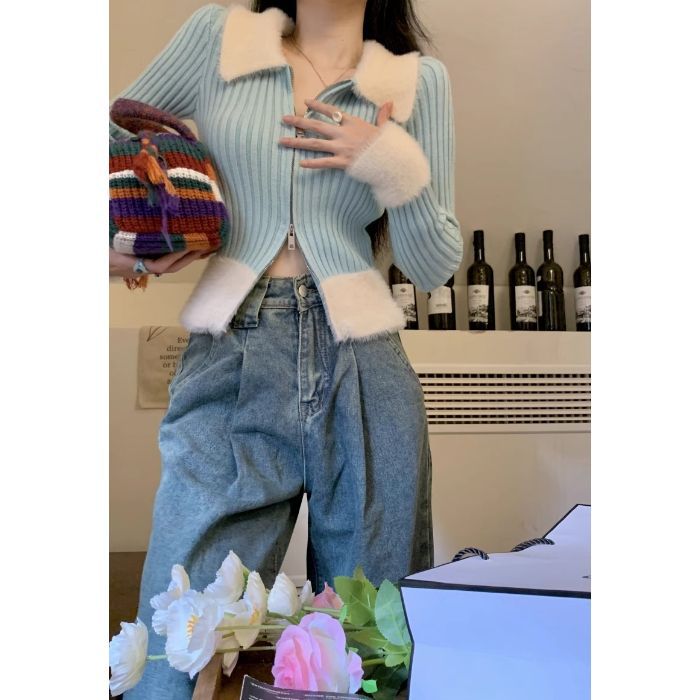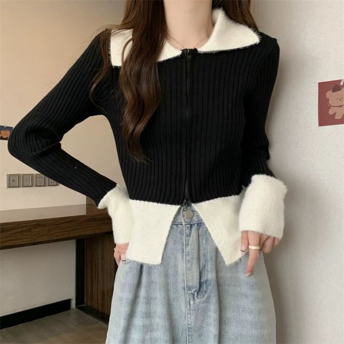 パッチワークデザインファーカラーファスナーカーディガンニット秋冬ピュアセクシー甘辛系スリムシルエットファッショナブルトップス