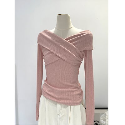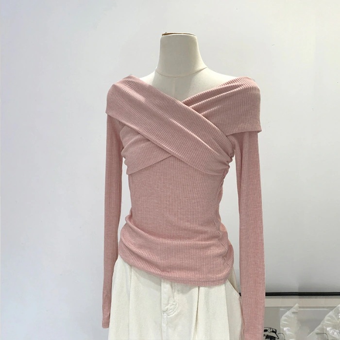 韓国系無地オフショルダークロスVネックプリーツインナーレディースシルエット万能オフショルTシャツトップス[2カラー]