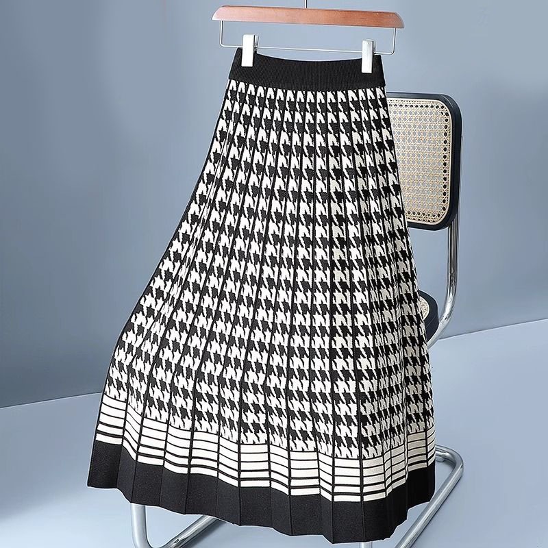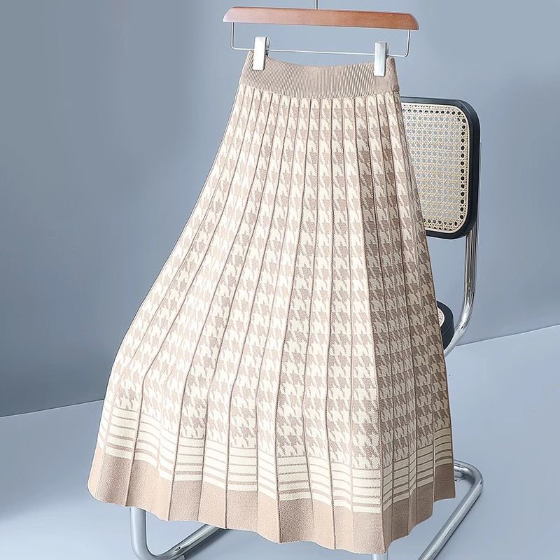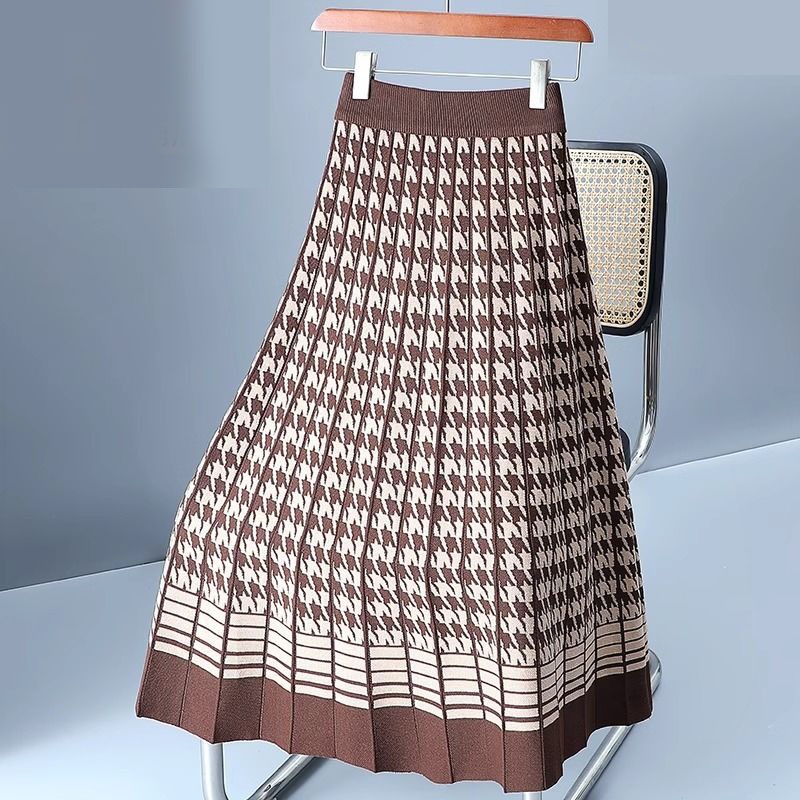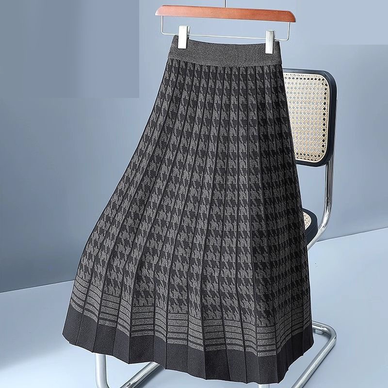 スカート レディース ブラック ベージュ ミモレ ニット 柄 タイル柄 落ち感 おしゃれ きれいめ 高貴な佇まいに プリーツ風ニットスカート 40代 50代 60代