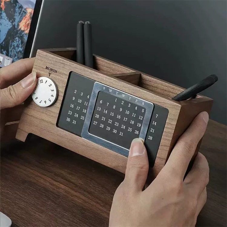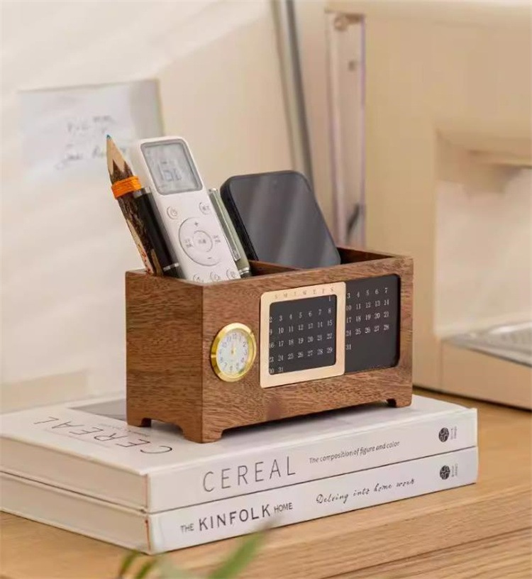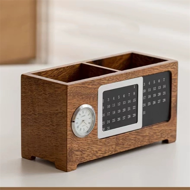 早い者勝ち 天然木の温もりを感じるデスクトレイ クオーツ時計とカレンダーを一体化した設計で 毎日のスケジュール管理と文房具の整理が一つで可能 和室にも洋室にもなじむナチュラルデザイン