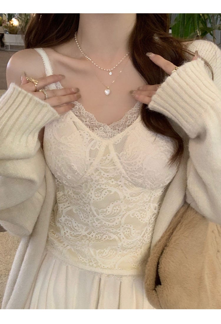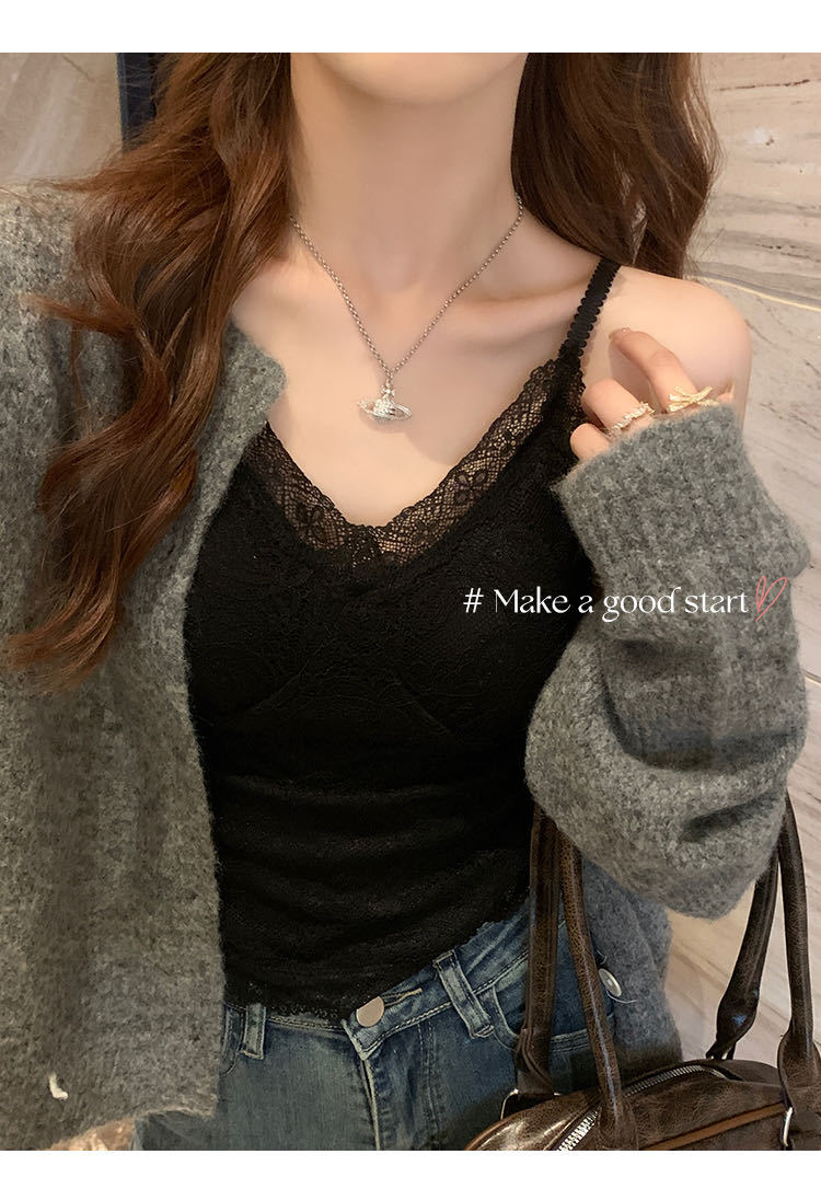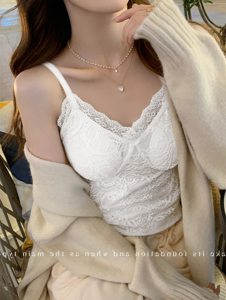 2026 新作 3色 キャミソール カップ付き Vネックブラトップ フレンチ レース ブラパッド付き 裏起毛 サスペンダー ベスト レディース 暖かい 美胸インナー 美背中 トップス 美胸インナー